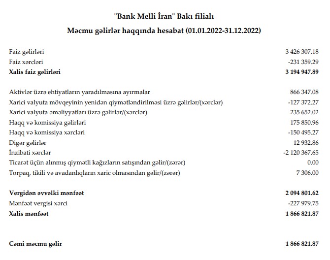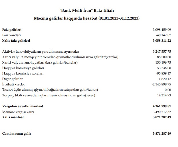 "Bank Melli İran" Bakı filialı 2023-cü ili 3 milyon 871 min manat xalis mənəət ilə başa vurub. Filial 2022-ci ili 1 milyon 867 min manat xalis mənəət ilə bağlamışdı. Beləkilə, "Bank Melli İran" Bakı filialının xalis mənfəəti 2023-cü ildə 2022-ci illə müqayisədə 2 milyon 4 min manat və ya 2,1 dəfə artıb. Bankın xalis mənfəətinin kəskin artması ehtimal olunan itkilər üzrə yaradılan ehtiyatdan qayıdan vəsaitin 3,7 dəfə artaraq 3 247 min manat təşkil etməsilə əlaqədardır.