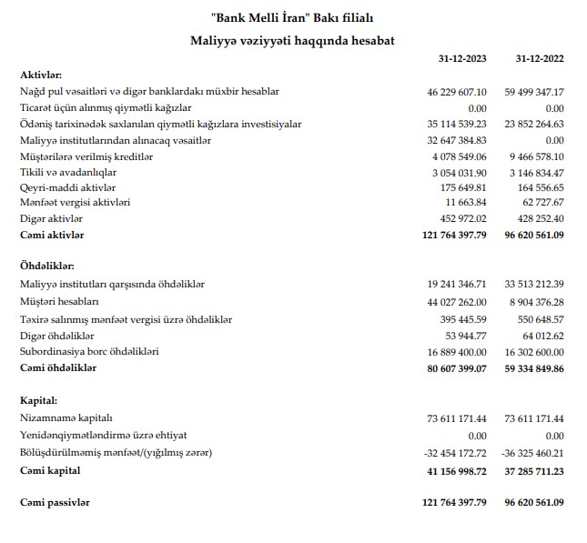 "Bank Melli İran" Bakı filialı qiymətli kağızlara investisiyalarını 47% artıraraq 35 milyon 114 min manata çatdırıb. 2023-cü ilin sonunda Filialın faliyyə institutlarından alınacaq vəsaitləri olmadığı halda, 2023-cü ilin sonunda 32 milyon 647 min manat təşkil edib.