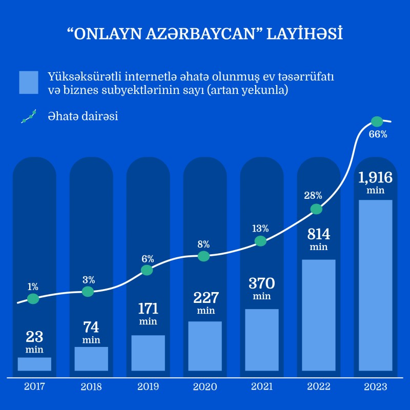 Qeyd edilib ki, 2017-2020-ci illərdə 227 min, 2021-2023-cü illərdə isə 1 milyon 916 min ev təsərrüfatı və biznes subyekti genişzolaqlı internetə çıxış əldə edib. Bu, əvvəlki 4 illə müqayisədə 8,4 dəfə çox deməkdir.