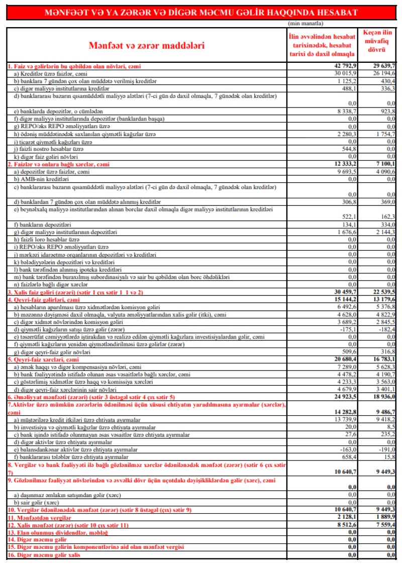 Müqayisə üçün qeyd edək ki, 2022-ci ildə "Ziraat Bank Azərbaycan"ın cəmi əməliyyat gəlirləri 42 milyon 819,3 min manat, cəmi əməliyyat xərcləri 23 milyon 883,2 min manat, əməliyyat mənfəəti 18 milyon 936,1 min manat, aktivlər üzrə mümkün zərərlərin ödənilməsi üçün xüsusi ehtiyatın yaradılmasına ayrılan vəsait 9 milyon 486,7 min manat, ödənilən mənfəət vergisi 1 milyon 889,9 min manat təşkil etmişdi.