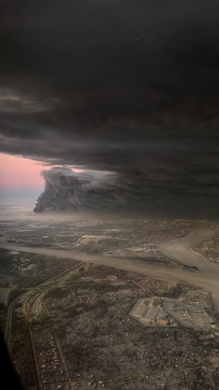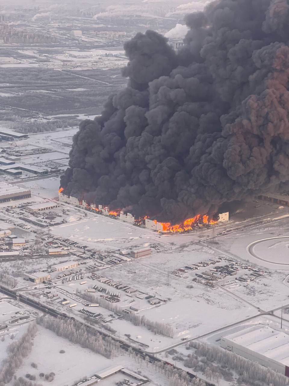 Sankt-Peterburq yaxınlığındakı Wildberries anbarında baş verən yanğın havadan belə görünür.