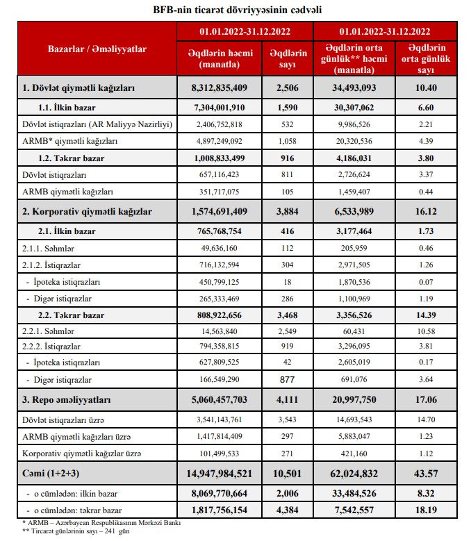 2023-cü ildə dövlət istiqrazları ilə repo əməliyyatlarının həcmi 10 milyard 406 milyon 847 min manat və ya təxminən 4 dəfə artaraq 13 milyard 947 milyon 991 min manat təşkil edib. 2022-ci ildə dövlət istiqrazları ilə repo əməliyyatlarının həcmi 3 milyard 541 milyon 144 min manat olmuşdu.