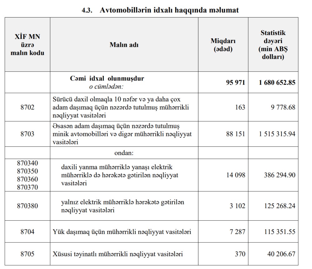 2023-cü ildə Azərbaycana 1 milyard 680 milyon 653 min dollar dəyərində 95 min 971 ədəd nəqliyyat vasitəsi, o cümlədən 1 milyard 515 milyon 316 min dollar dəyərində 88 min 151 ədəd minik avtomobili idxal olunub.