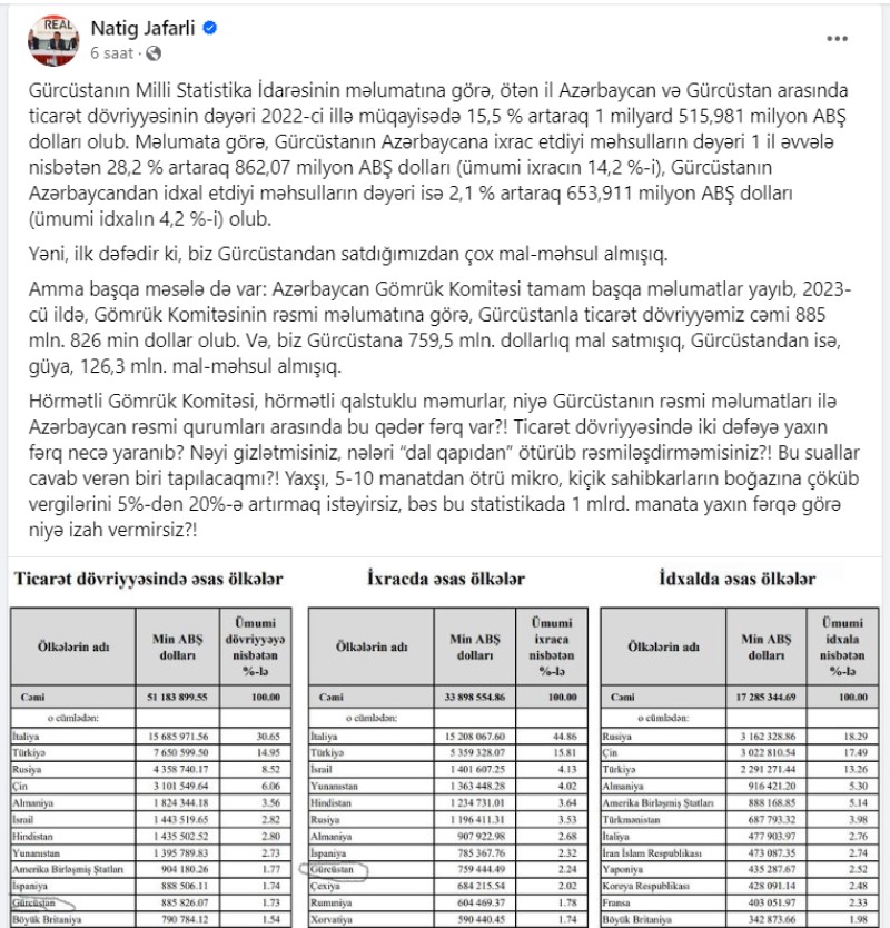 2023-cü il ərzində Dövlət Gömrük Komitəsinin məlumat bazasında Azərbaycana idxal olunmuş Gürcüstan mənşəli malların dəyəri 126 mln. ABŞ dolları təşkil etsə də, Gürcüstan Respublikasının www.geostat.ge veb-səhifəsində yayınladığı ilkin xarakterli məlumatlarda (preliminary data) Azərbaycana ixrac olunmuş malların dəyəri 862 mln. ABŞ dolları göstərilmişdir.