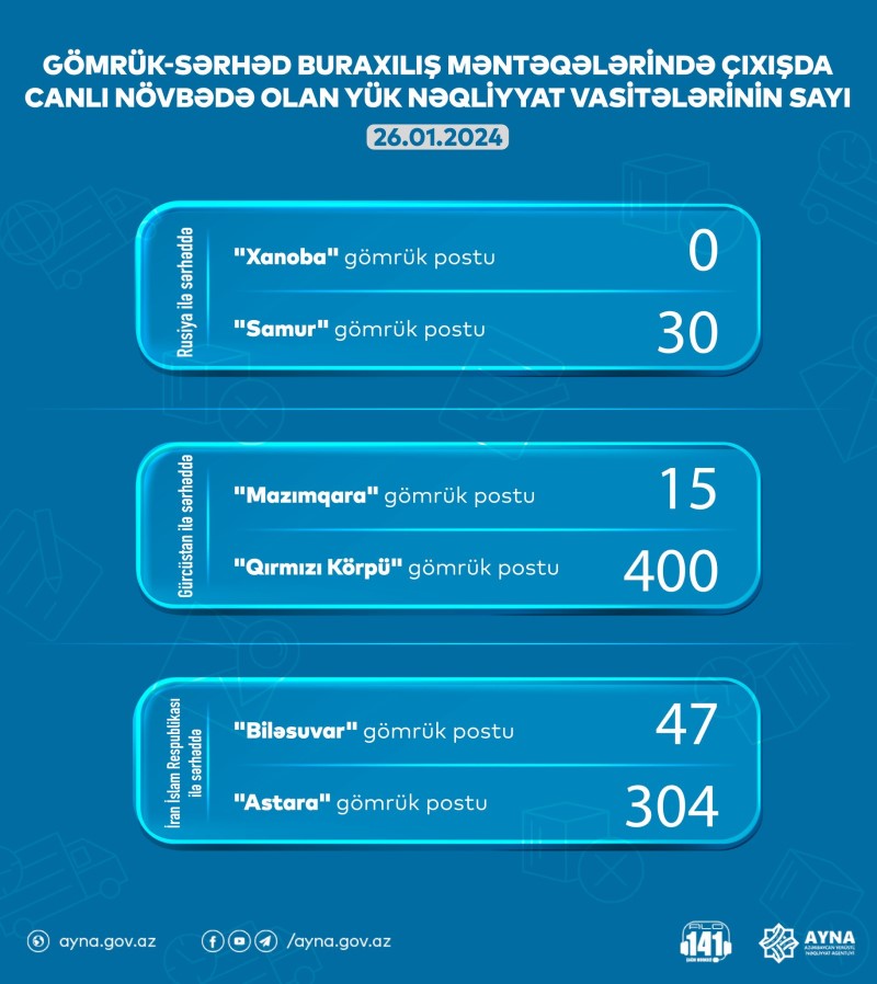 Gömrük-sərhəd məntəqələrində çıxışda gözləmədə olan nəqliyyat vasitələrinin sayı barədə məlumata əsasən, Samur gömrük postunda 30, "Mazımqara" gömrük postunda 15, "Astara" gömrük postunda 304, "Biləsuvar" gömrük postunda 47 yük maşını var.