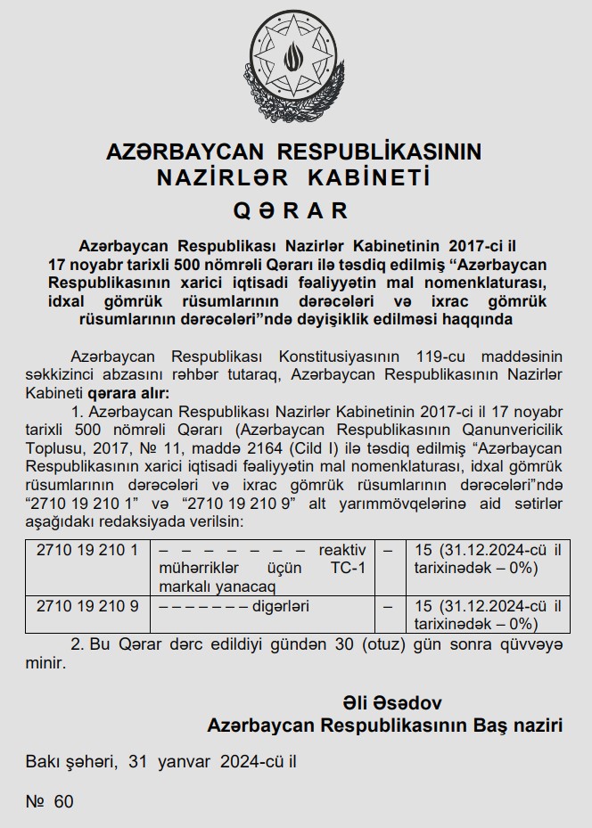 Bundan başqa, Nazirlər Kabineti 17 noyabr 2017-ci il tarixli qərarı ilə təsdiq edilmiş “Azərbaycan Respublikasının xarici iqtisadi fəaliyyətin mal nomenklaturası, idxal gömrük rüsumlarının dərəcələri və ixrac gömrük rüsumlarının dərəcələri” ilə bağlı qərarında dəişiklik edib. Bununla bağlı Ə.Əsədovun imzaladığı yeni qərar əsasən, ölkədə idxal olunan eaktiv mühərriklər üçün TC-1 markalı yanacaq və digər yanacaq növləri bu ilin sonuna qədər (daha 1 il) 15 %-lik gömrük rüsumundan azad edilib.