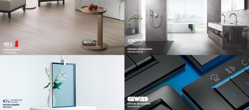 Hamam aksesuarları Almaniya istehsalı “Grohe” və “Hansgrohe”, pəncərə şüşələri Amerika markası “Guardian Glass”, kabel sistemi İtaliya markası “Prysmian” yanmayan kabelləri, parketlər Kanada markası “Coswick”, elektrik açarları və aksesuarları İtaliya istehsalı “Gewiss”dir.