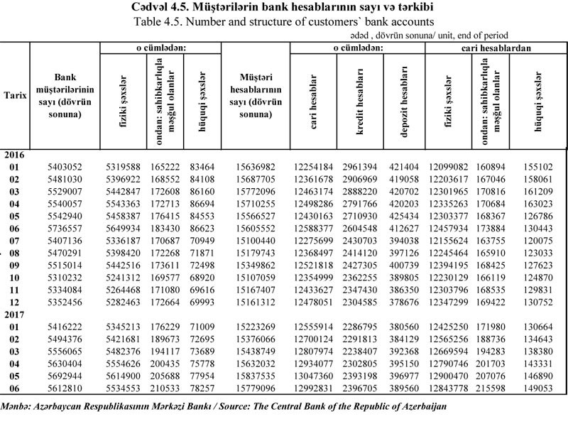 “Marja” Mərkəzi Banka istinadən xəbər verir ki, 2017-ci ilin İyun ayında bank müştərilərinin sayı May ayının sonundakı 5692944-dan 5612810-a geriləyib. O cümlədən fiziki şəxs müştərilərin sayı 5614900-dən 5534553-ə düşüb. Ondan sahibkarlıqla məşğul olan fiziki şəxs müştərilərin sayı 205688-dən 210533-ə qalxıb. Hüquqi şəxs müşətərilərin sayı isə 77954-dən 78257-yə çıxıb.