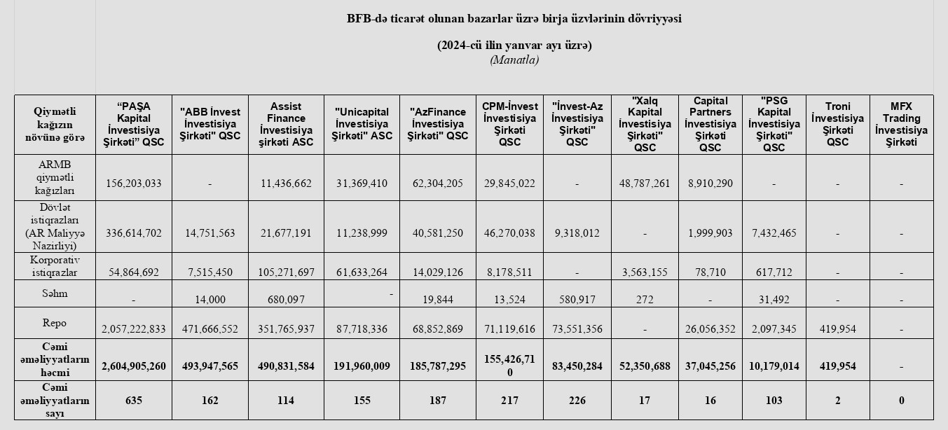 Marja.az Birjaya istinadən xəbər verir ki, 2024-cü ilin Yanvar ayında “PAŞA Kapital İnvestisiya Şirkəti” QSC 2 milyard 604 milyon 905 min manat dövriyyə ilə 1-ci, "ABB İnvest İnvestisiya Şirkəti" QSC 493 milyon 947 min manat dövriyyə ilə 2-ci, "Assist Finance İnvestisiya Şirkəti" ASC 490 milyon 832 min manat dövriyyə ilə 3-cü yeri tutub.
