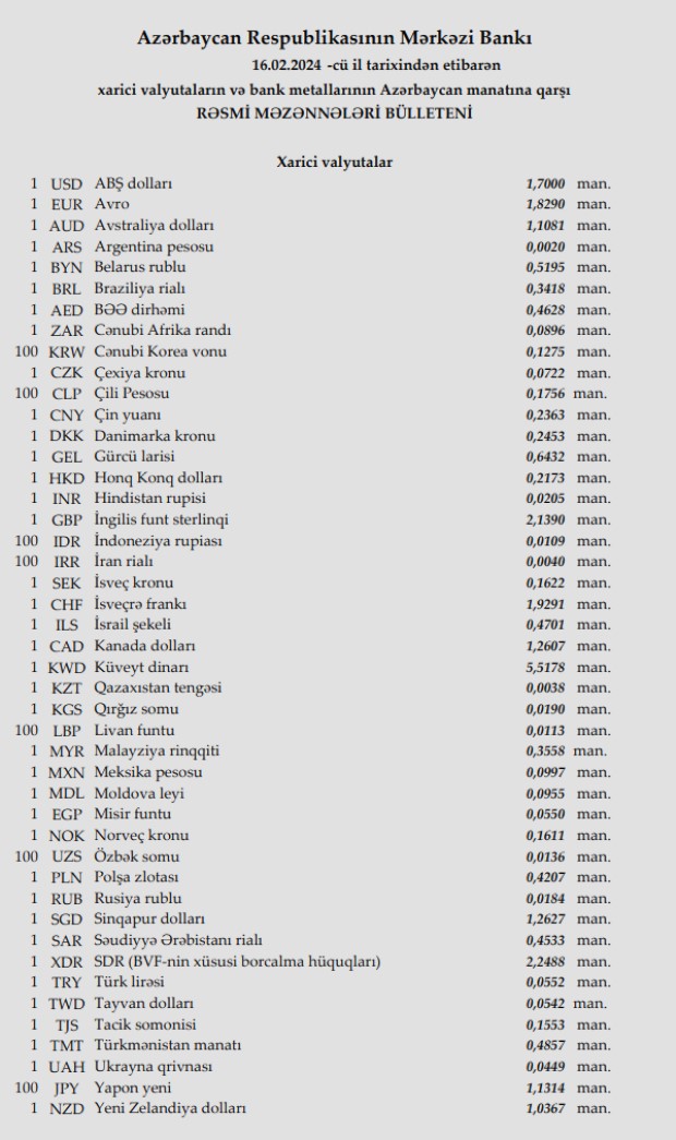 Rəsmi məzənnələr açıqlandı
