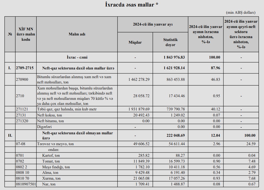 2024-cü ilin yanvar ayında Azərbaycanın ən çox ixrac və idxal etdiyi mallar.