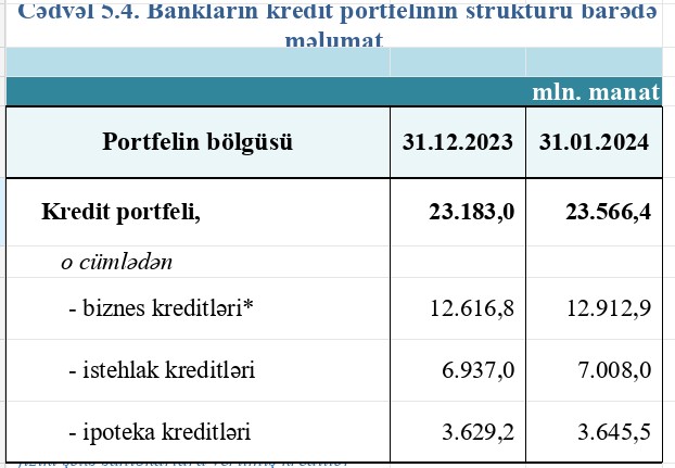Kredit portfelinin strukturu: ı) biznes kreditləri – 54.8% (12 milyard 912.9 milyon manat); ıı) istehlak kreditləri – 29.7% (7 milyard 8 milyard manat) və ııı) ipoteka kreditləri – 15.5% (3 milyard 645.5 milyon manat). Ay ərzində biznes, istehlak və ipoteka kreditləri müvafiq olaraq 296.1 milyon manat (+2.3%), 71 milyon manat (+1%) və 16.3 milyon manat (+0.4%) artmışdır.