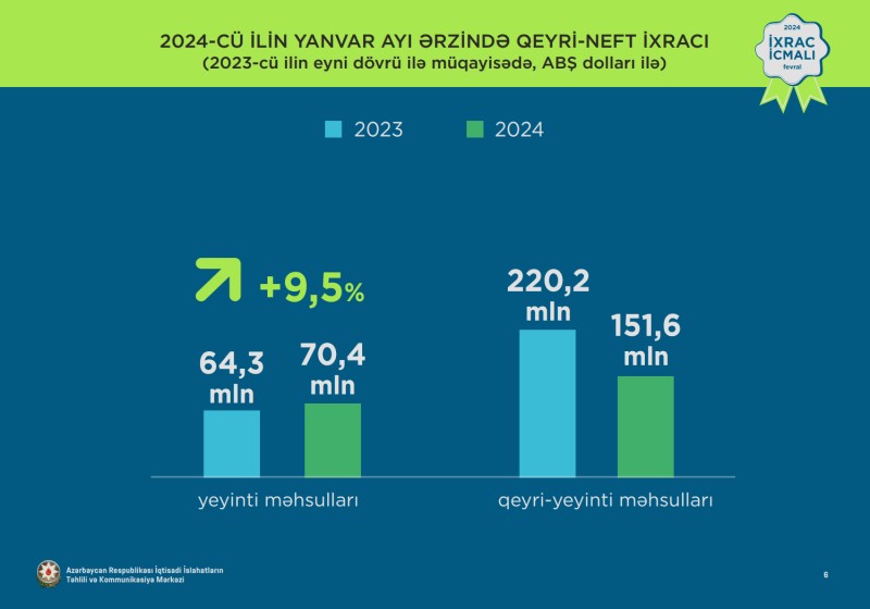 Marja.az "İxrac icmalı -2024/Fevral"a istinadən xəbər verir ki, 2024-cü ilin yanvar ayı ərzində yeyinti məhsulları üzrə ixrac ötən ilin müvafiq dövrü ilə müqayisədə 9,5% artaraq 70,4 milyon ABŞ dollarına, qeyri-yeyinti məhsulları üzrə ixrac isə 151,6 milyon ABŞ dollarına bərabər olub.