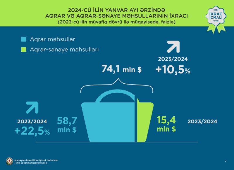 Cari ilin yanvar ayı ərzində aqrar və aqrar-sənaye məhsulları üzrə birgə ixracın statistik dəyəri 10,5% artaraq 74,1 milyon ABŞ dolları təşkil edib. Qeyrineft/qaz ixracının tərkib hissəsində əhəmiyyətli yer tutan aqrar-sənaye məhsullarının yaratdığı dəyər 15,4 milyon ABŞ dolları təşkil edib.