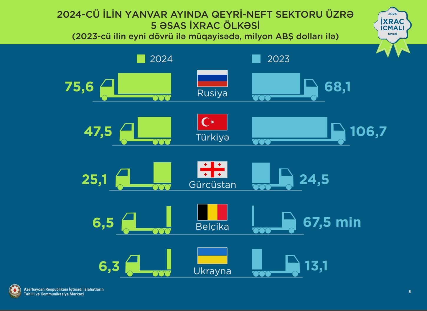 2024-cü ilin yanvar ayında qeyri-neft sektoruna aid ən çox mal ixrac edilən ölkələrin siyahısında Rusiya Federasiyası (75,6 milyon ABŞ dolları) birinciliyə yüksəlib. Bu siyahıda Türkiyə (47,5 milyon ABŞ dolları) ikinci və Gürcüstan (25,1 milyon ABŞ dolları) üçüncü olub.