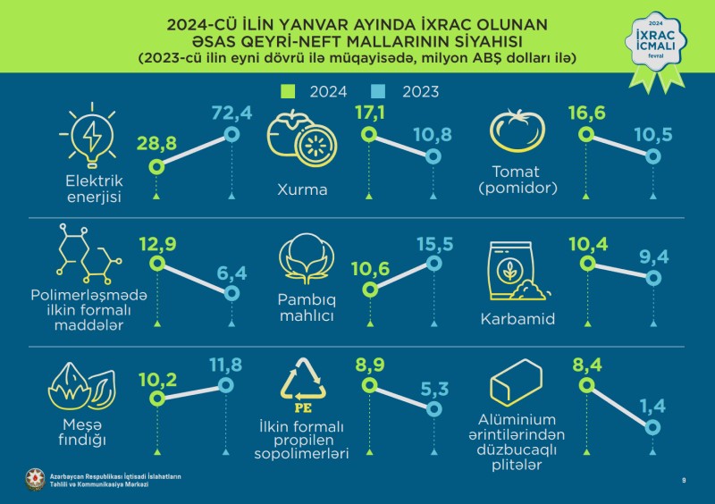 2024-cü ilin yanvar ayında ixrac edilən qeyri-neft sektoruna aid malların siyahısında elektrik enerjisi (28,8 milyon ABŞ dolları) birinci, xurma (17,1 milyon ABŞ dolları) ikinci və pomidor (tomat) (16,6 milyon ABŞ dolları) üçüncü olub.
