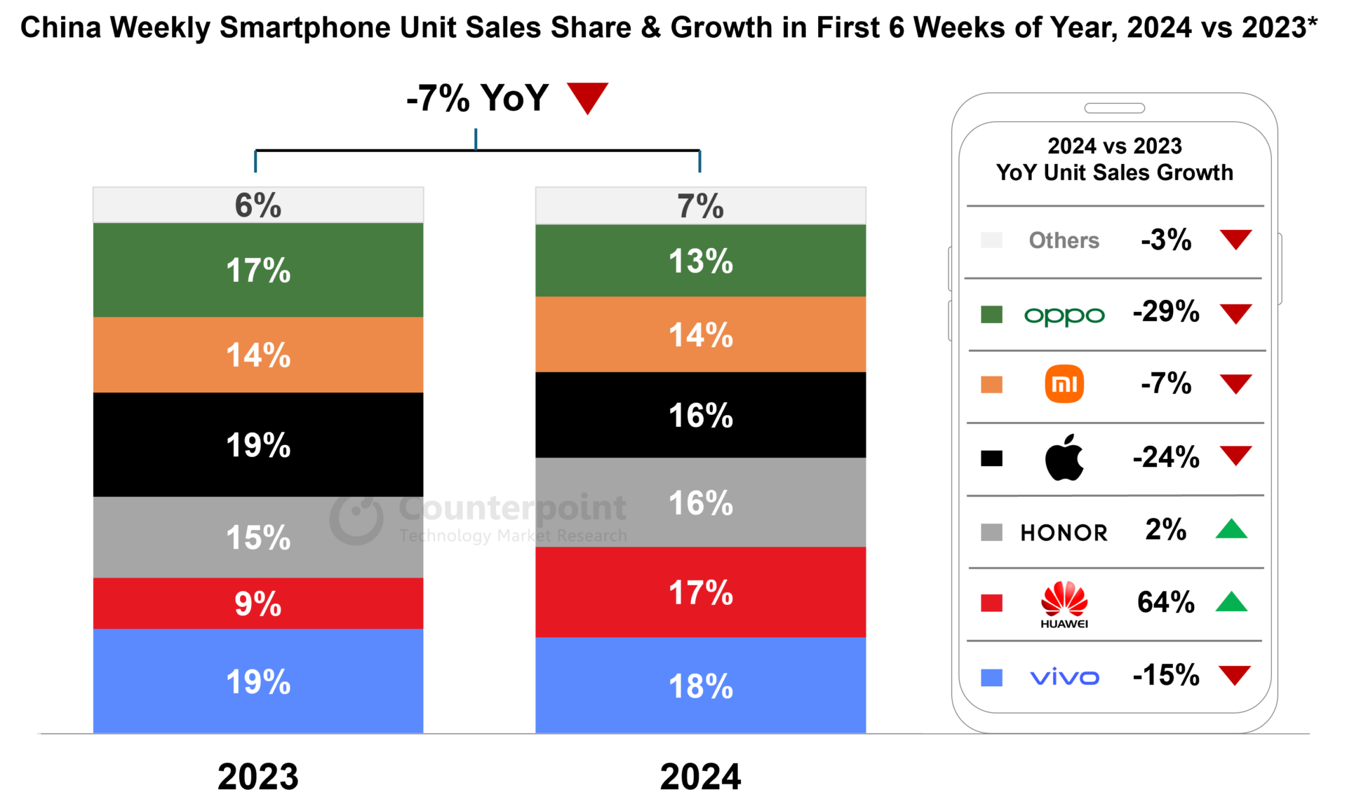 Öz növbəsində Huawei ikinci yerə yüksəlib, istehsalçının Çin smartfon bazarında bazar payı il ərzində 9,4%-dən 16,5%-ə yüksəlib. Çinin smartfon bazarı isə 7% azalıb.