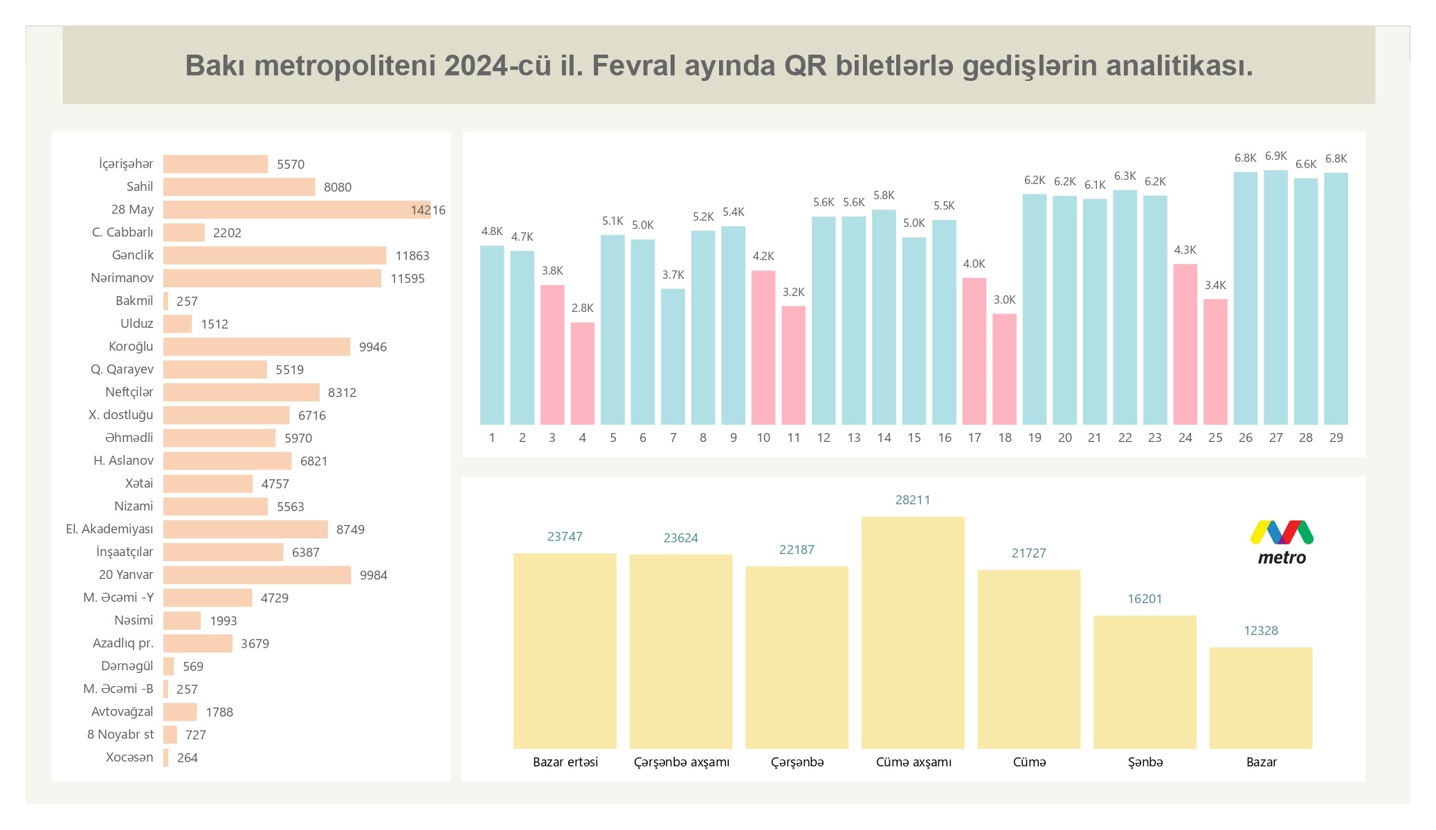 Bakı Metropoliteninin yaydığı məlumatda bildirilir ki, ay ərzində 148 min 025 sərnişin məhz bu üsulla ödənişə müraciət edib. QR biletlə ən çox ödəniş “28 May” stansiyasında qeydə alınıb – 14 min 216 sərnişin. Bu üsulla ən çox gedişhaqqı fevralın 27-si qeydə alınıb – 6 min 858 nəfər.