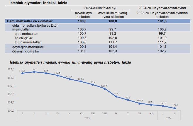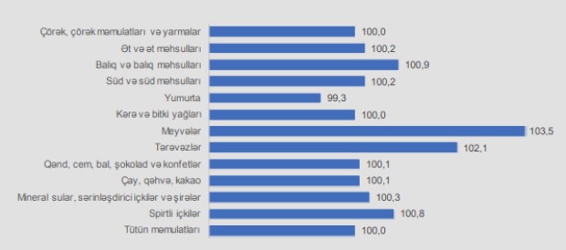 O cümlədən, fevralda qida məhsulları, içkilər və tütün məmulatları üzrə istehlak qiymətləri indeksi yanvarla müqayisədə 0,7 % artıb, əvvəlki ilin eyni dövrünə nisbətən isə 0,3 % azalıb. Ayrı-ayrı qida məhsullarından daha çox artım düyünün, qoyun ətinin, təzə balığın, kəsmiyin, kərə və zeytun yağının, naringinin, bananın, almanın, armudun, heyvanın, narın, kələmin, xiyarın, pomidorun, balqabağın, çuğundurun, sarımsağın, soğanın, şəkərin, arağın, azalma isə əsasən qarabaşaq yarmasının, yumurtanın, süfrə marqarininin, günəbaxan və qarğıdalı yağlarının, portağalın, yerkökünün qiymətlərində müşahidə olunub. Digər qida məhsullarının qiymətlərində ciddi dəyişikliklər baş verməyib.