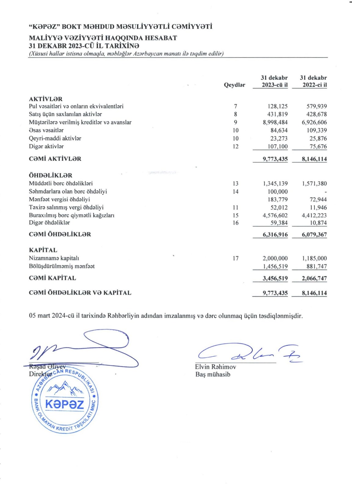 2023-cü ildə "Kəpəz BOKT" MMC-nin cəmi aktivləri 1 milyon 627 min manat və ya 20% artaraq 9 milyon 773 min manata yüksəlib.