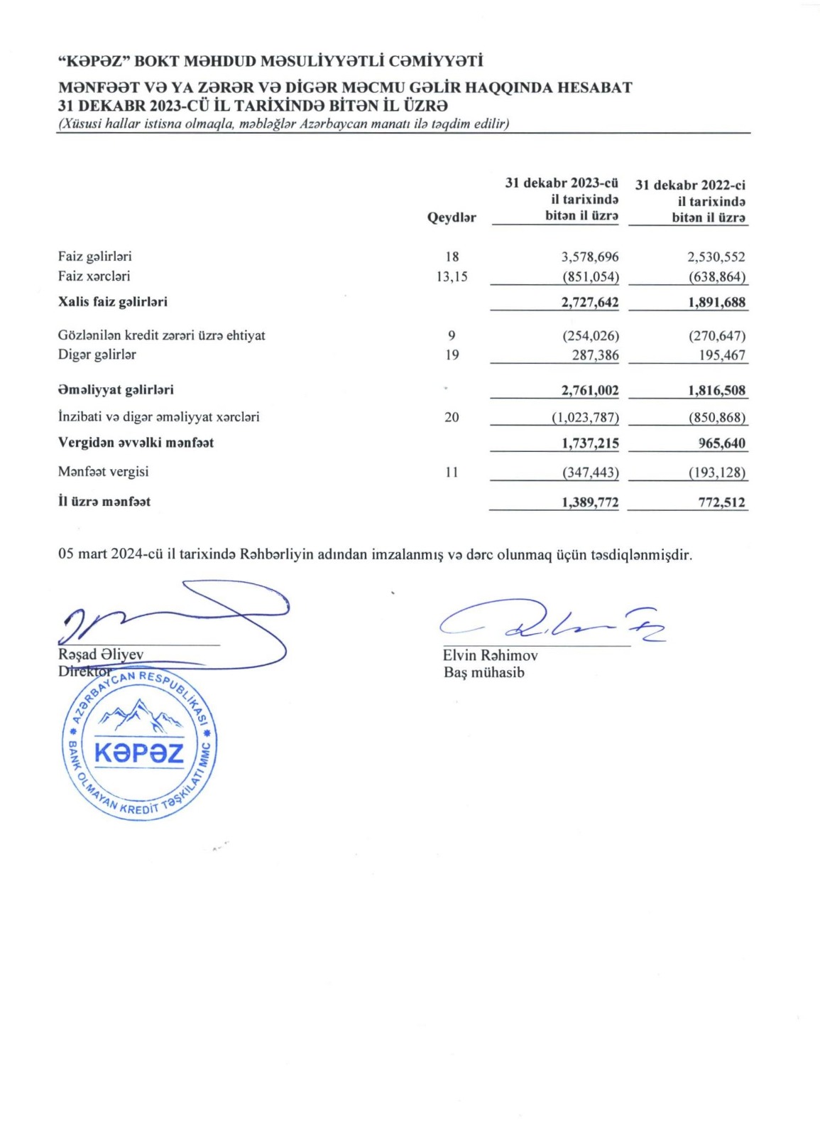 "Kəpəz BOKT" MMC 2023-cü ili 1 milyon 390 min manat xalis mənfəət ilə başa vurub. Təşkilat 2022-ci ili 773 min manat xalis mənfəət ilə bağlamışdı. Beləliklə, "Kəpəz BOKT"ın xalis mənfəəti 2023-cü ildə 2022-ci illə müqayisədə 617 min manat və ya 80% artıb. Xalis mənfəətin artması kredit portfelinin və müvafiq olaraq faiz gəlirlərin artmasından qaynaqlanır.