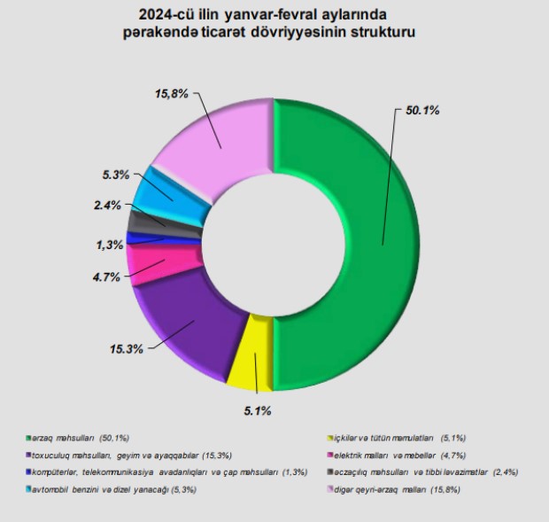 2024-cü ilin yanvar-fevral aylarında pərakəndə ticarət şəbəkəsində istehlakçılara 8 milyard 555 milyon manatlıq, o cümlədən 4 milyard 726,4 milyon manatlıq ərzaq məhsulları, içkilər və tütün məmulatları, 3 milyard 828,6 milyon manatlıq qeyri-ərzaq malları satılmışdır.