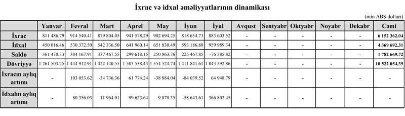 O cümlədən, yanvar-iyul ayları ərzində idxal əməliyyatları 4 milyard 369 milyon 692.31 min ABŞ dolları (Keçən ilin müvafiq dövrünə nisbətən 8.17 % azalmışdır), ixrac əməliyyatları 6 milyard 152 milyon 362.04 min ABŞ dolları (Keçən ilin müvafiq dövrünə nisbətən 6.03 % azalmışdır) təşkil etmişdir.