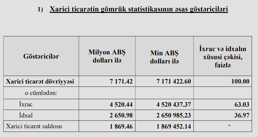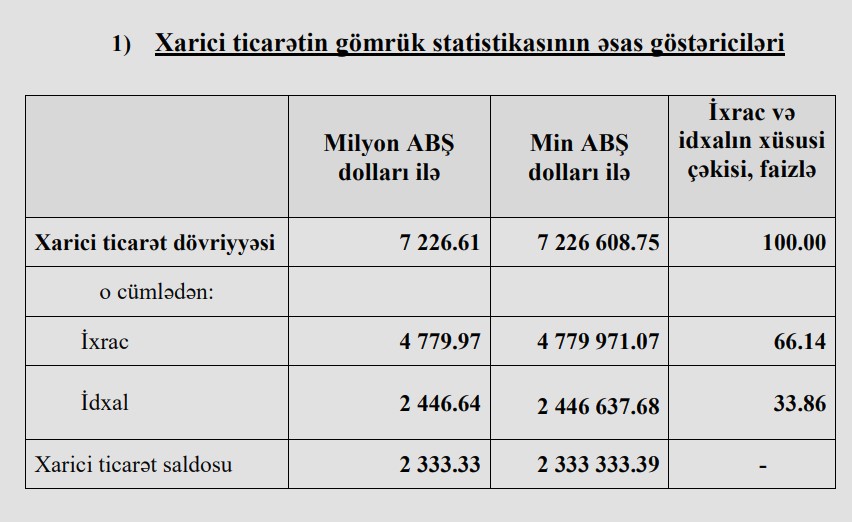 Qeyd edək ki, 2023-cü ilin ilk 2 ayında Azərbaycanın xarici ticarət dövriyyəsi 7 milyard 171 milyon 422 min dollar, ixrac 4 milyard 520 milyon 437 min dollar, idxal 2 milyard 650 milyon 985 min dollar, xarici ticarət saldosu 1 milyard 869 milyon 452 min dollar təşkil etmişdi.