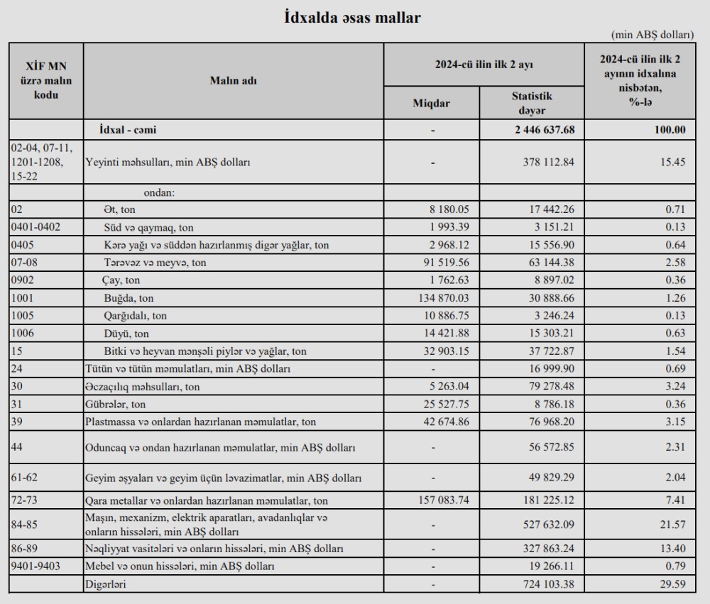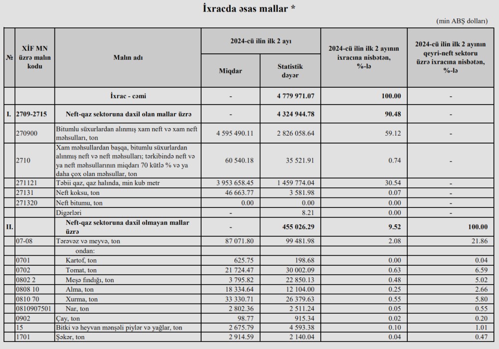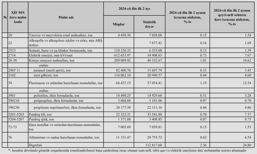 2024-cü ilin yanvar-fevral aylarında (ilk 2ayda) Azərbaycanın ən çox ixrac və idxal etdiyi mallar.