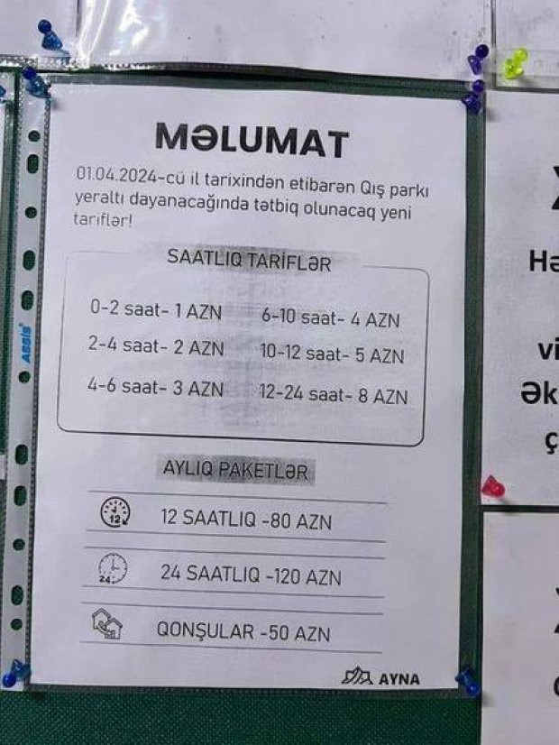 Məlumata görə, 0-1 saat üçün 1 AZN, 1-3 saat üçün 2 AZN, 3-6 saat üçün 3 AZN, 6-12 saat üçün 5 AZN, 12-24 saat üçün 10 AZN ödəniş tələb