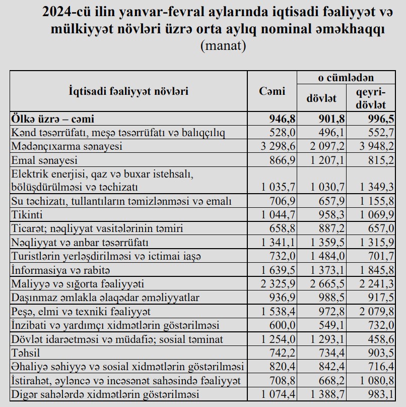 2024-cü ilin yanvar-fevral aylarında ölkə iqtisadiyyatında muzdla çalışan işçilərin orta aylıq nominal əməkhaqqı 2023-cü ilin müvafiq dövrünə nisbətən 10,8 faiz artaraq 946,8 manat təşkil etmişdir.