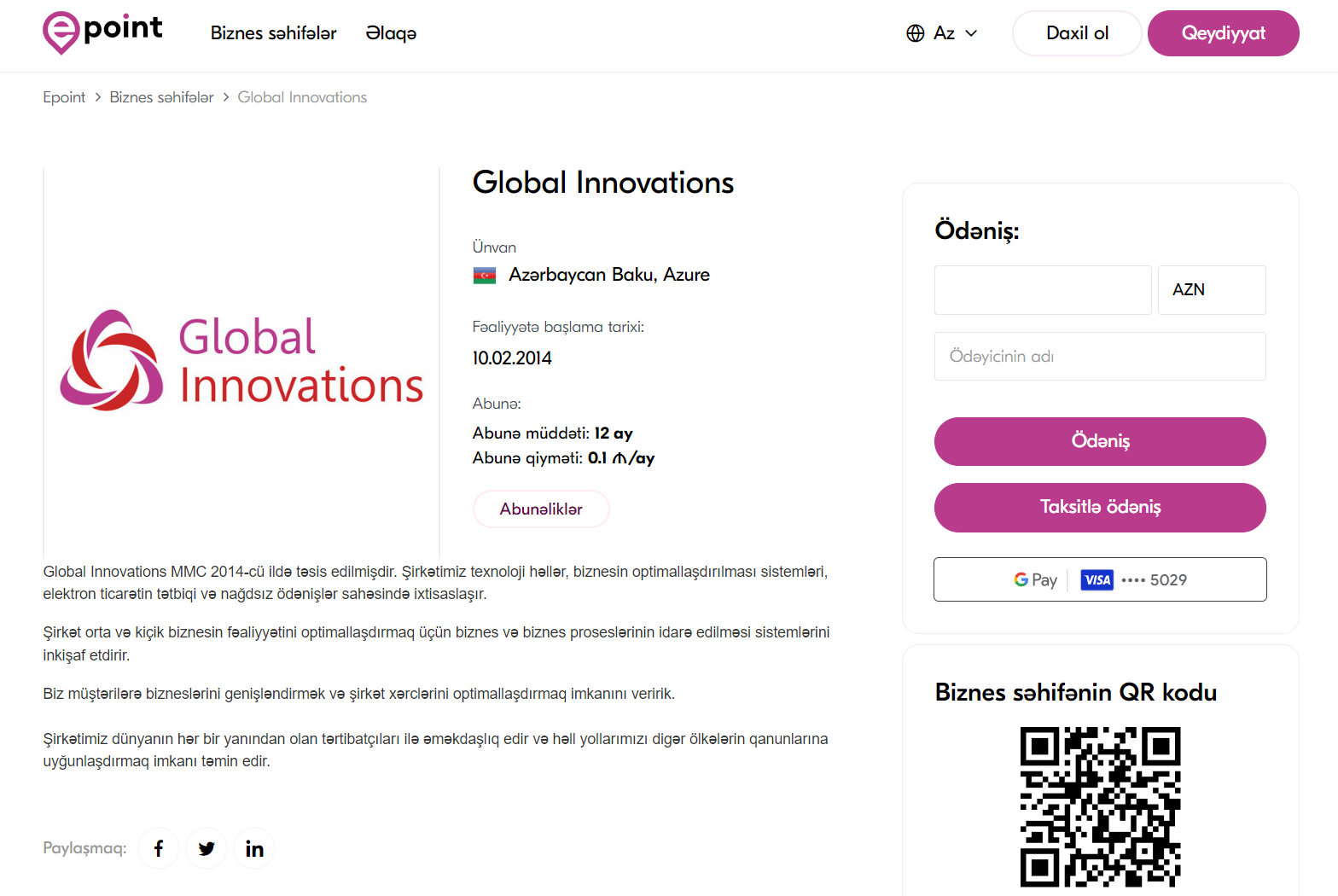 Bu xidmət həm saytı və mobil tətbiqi olan müştərilər üçün API inteqrasiya üzərindən, həm də heç bir resursu olmayan kiçik müştərilər üçün, Epoint-in təqdim etdiyi “Biznes Səhifə” üzərindən təqdim oluna bilər.
