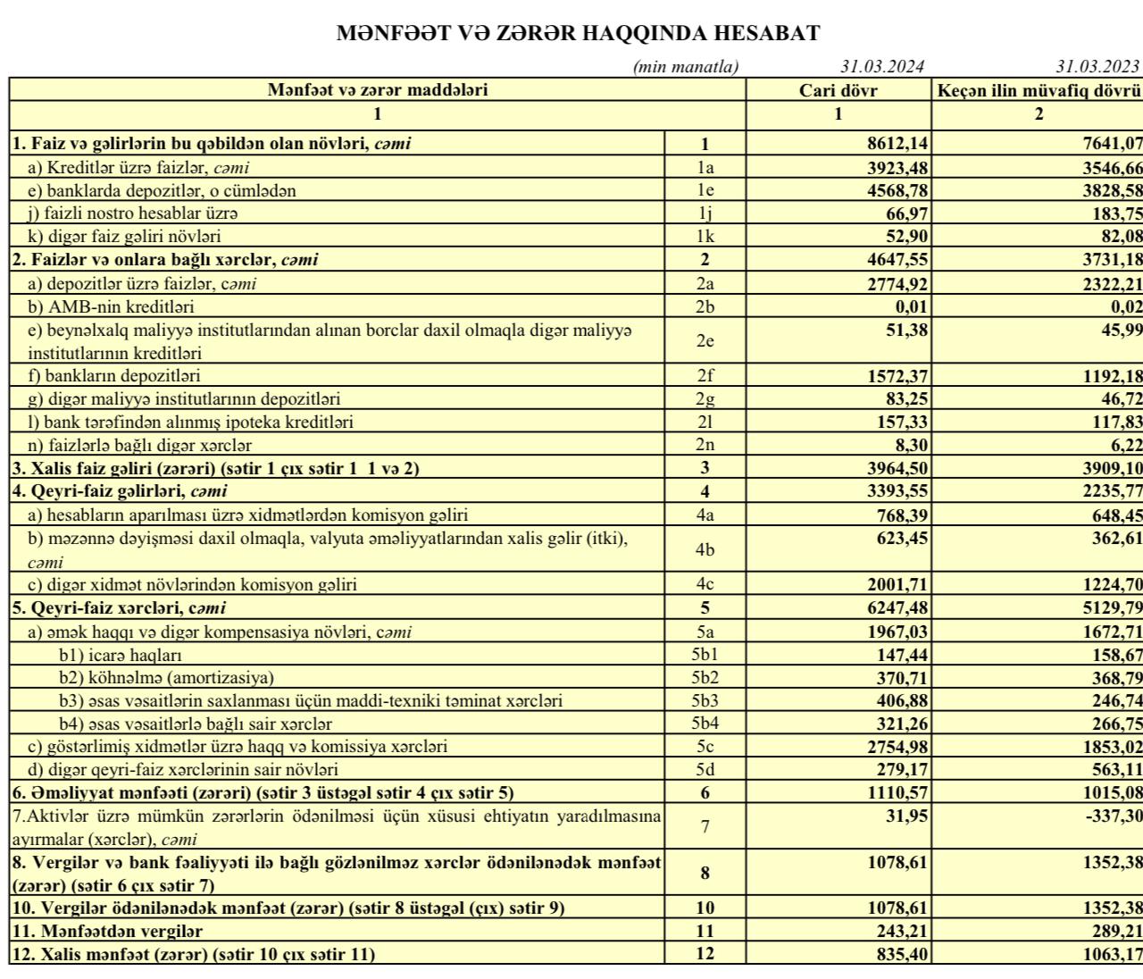 "Azərbaycan Sənaye Bankı" ASC 2024-cü ilin 1-ci rübünü (yanvar-mart) 835 min manat xalis mənfəət ilə başa vurub.