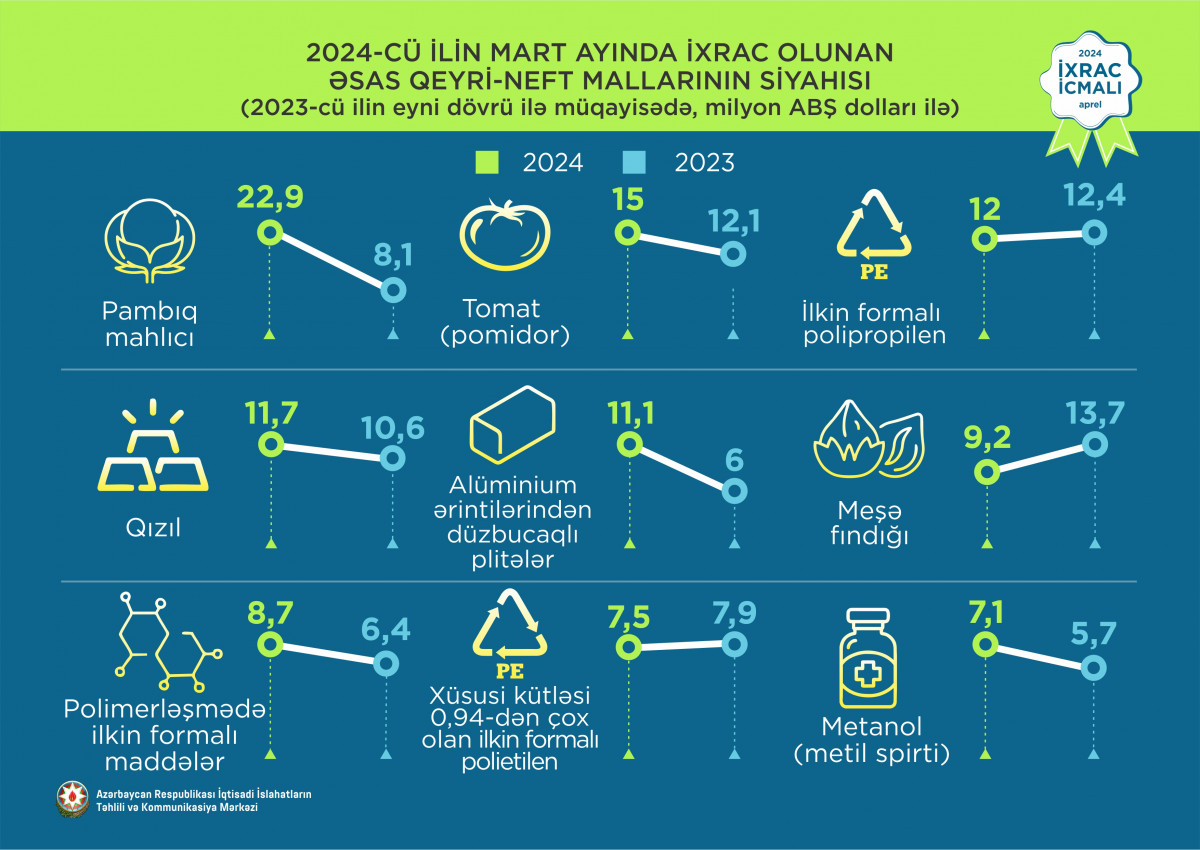 2024-cü ilin yanvar-mart ayları ərzində ixrac edilmiş qeyri-neft sektoruna aid malların siyahısında pambıq mahlıcı (56,5 milyon ABŞ dolları) birinci olub. Bu siyahıda pomidor (tomat) (45 milyon ABŞ dolları) ikinci, elektrik enerjisi (40,6 milyon ABŞ dolları) isə üçüncü yerdə qərarlaşıb.