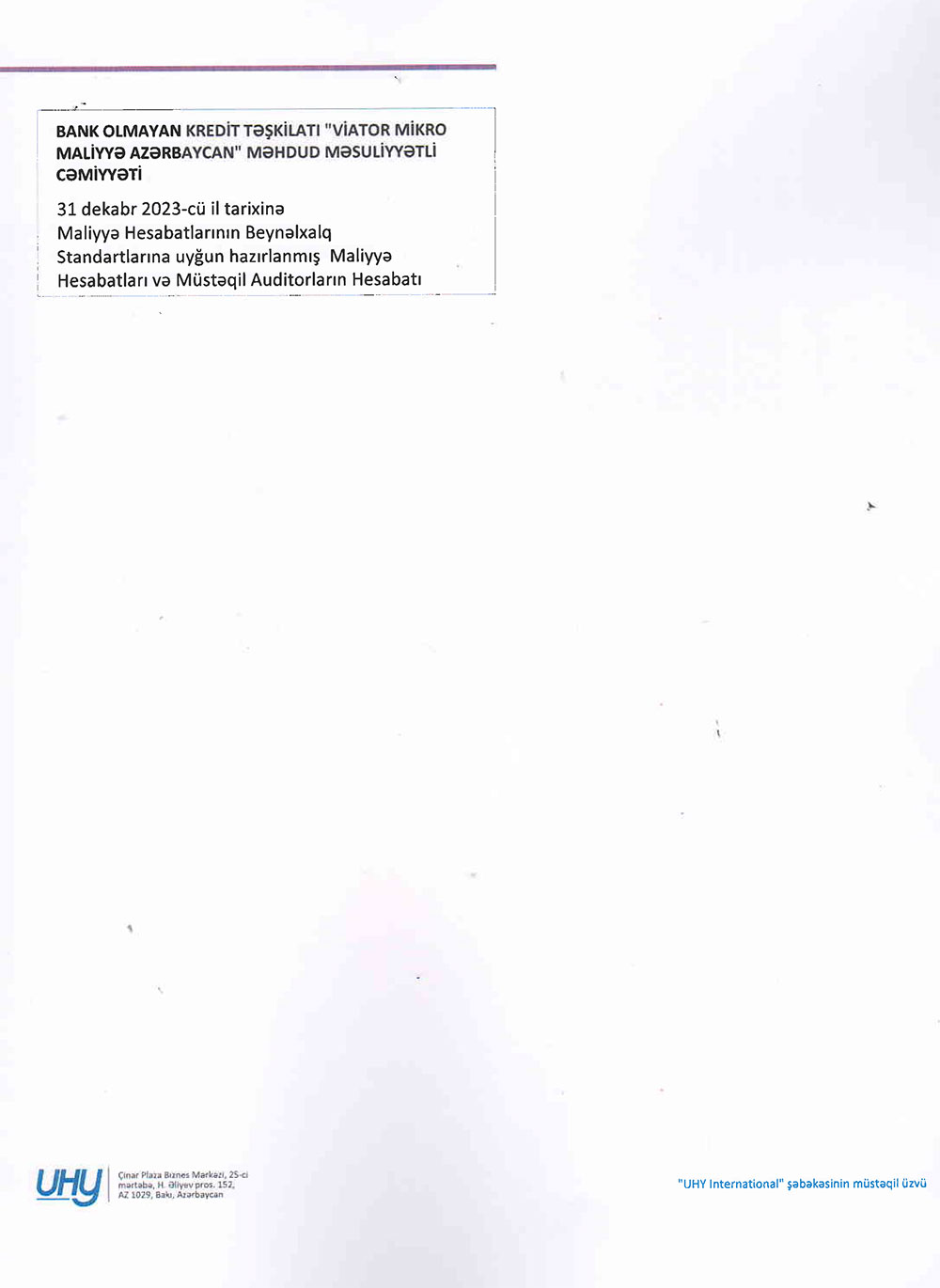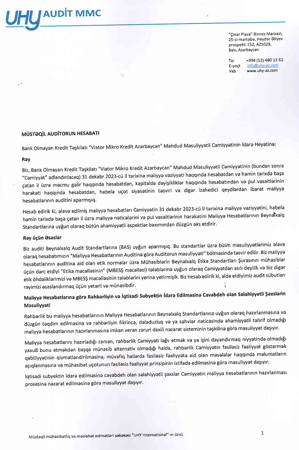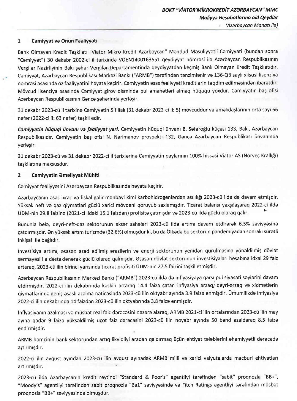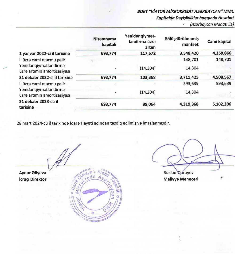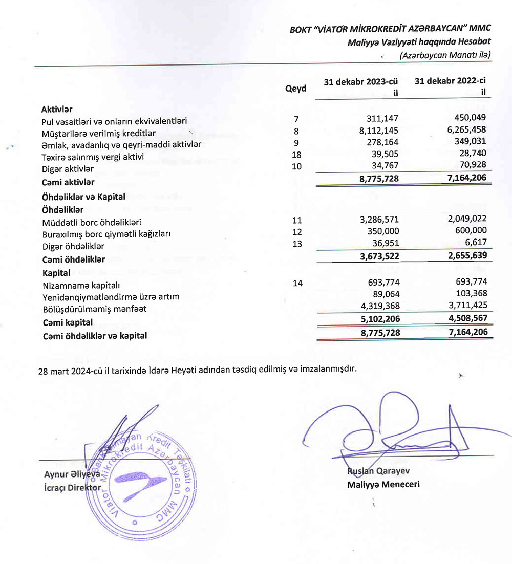 BOKT "Viator Mikrokredit Azərbaycan" MMC-nin 2023-ci ilin sonuna olan maliyyə və audit hesabatı ilə aşağıda və ya buradan daha ətraflı tanış ola bilərsiniz.