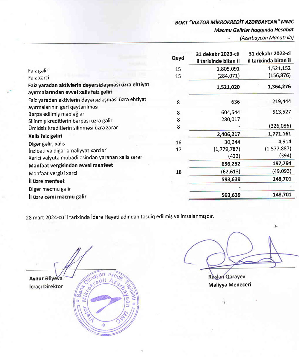 BOKT "Viator Mikrokredit Azərbaycan"ın gəlirləri və mənfəəti artıb - 2023-CÜ İLİN HESABATI