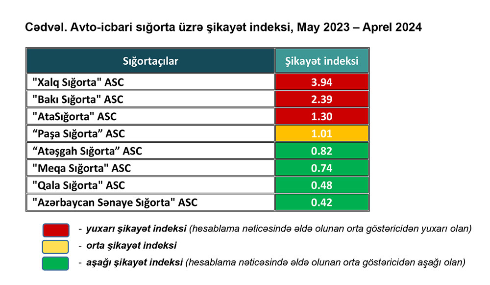 Aşağı şikayət indeksində "Azərbaycan Sənaye Sığorta" ASC, "Qala Sığorta" ASC, "Meqa Sığorta" ASC və “Atəşgah Sığorta” ASC yer tutublar.