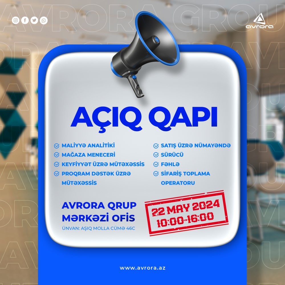 Açıq qapı zamanı vakansiyalar üzrə müraciətlər qəbul edilərək müsahibələr keçiriləcəkdir. Əgər siz də “Avrora Qrup” komandasının üzvü olmaq istəyirsinizsə o zaman bu fürsətdən yararlana bilərsiniz. Maraqlanan şəxslərin “Avrora Qrup” baş ofisinə yaxınlaşması xahiş olunur.