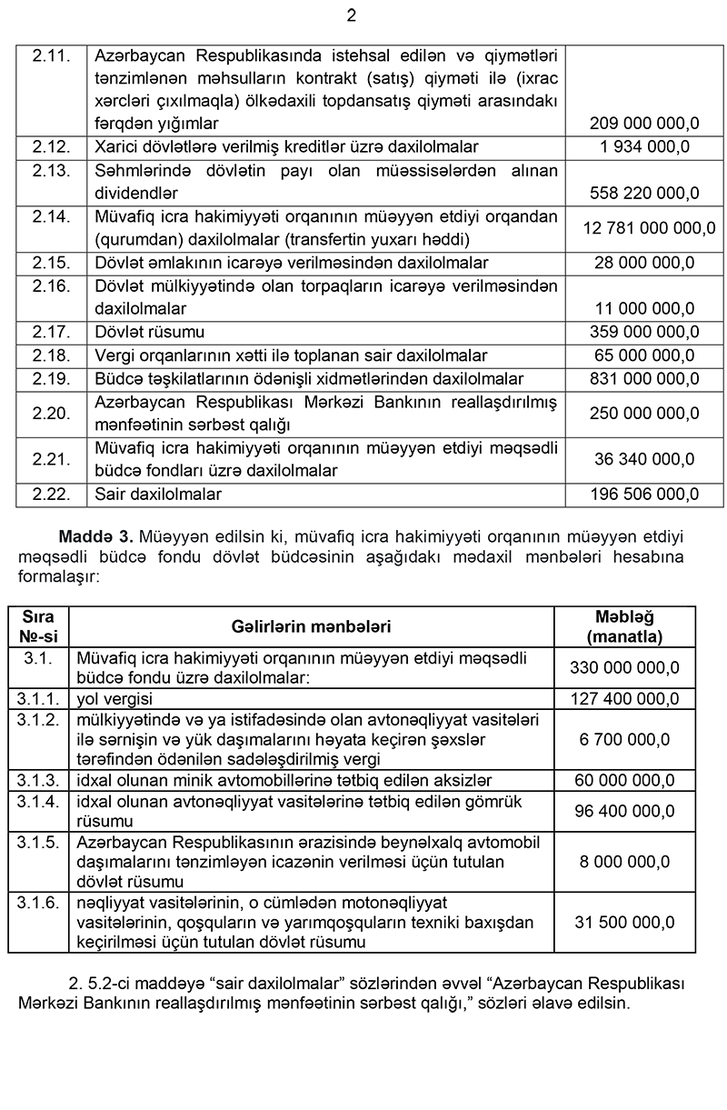 Mövcud daxilolma mənbələrindən əlavə olaraq dövlət büdcəsinə Azərbaycan Respublikası Mərkəzi Bankının reallaşdırılmış mənfəətinin sərbəst qalığından 250,0 milyon manat, “Nəqliyyat vasitələrinin utilizasiyası Fondu”na (məqsədli büdcə fondu) isə 25 milyon manat səviyyəsində daxilolma proqnozlaşdırılır.