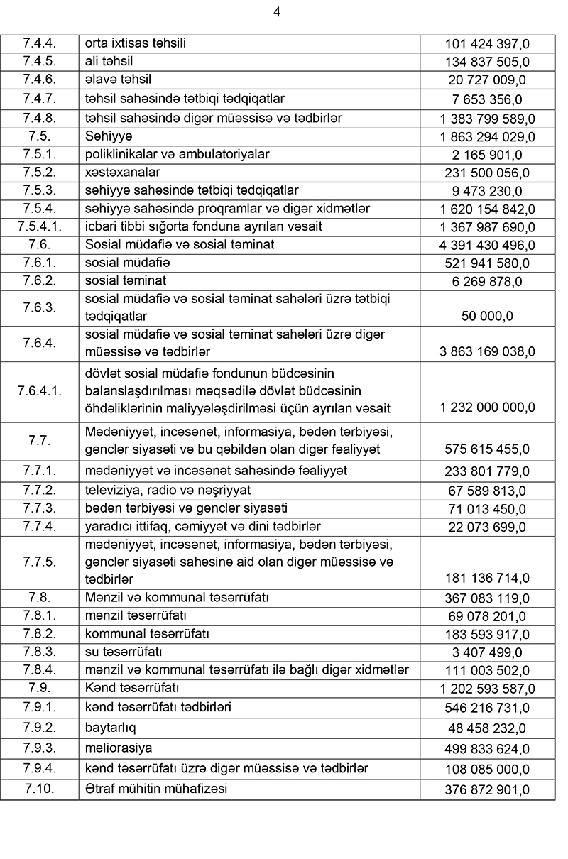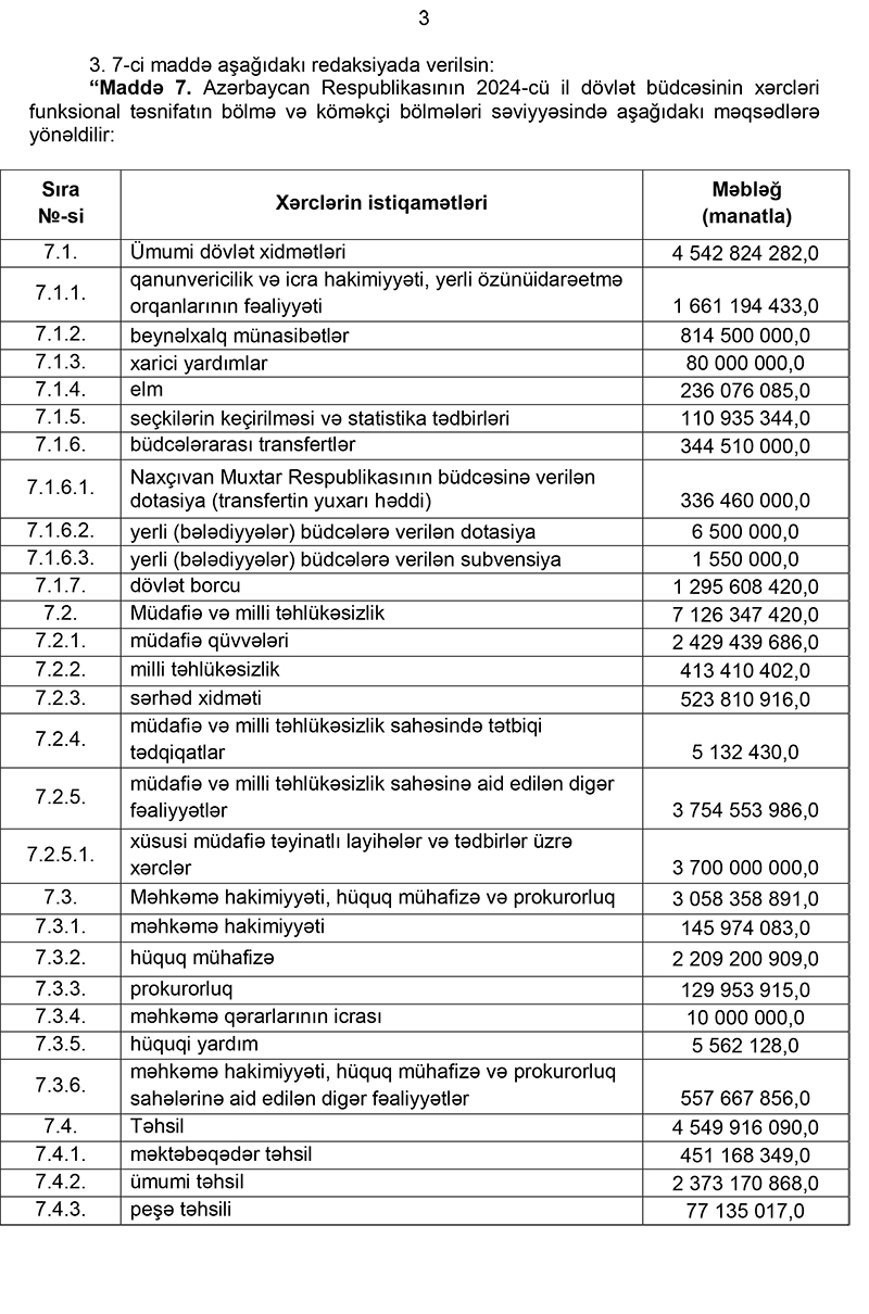 Yenidən baxılma ilə 2024-cü il dövlət büdcəsinin xərcləri funksional təsnifata uyğun olaraq iqtisadi fəaliyyət (dövlət əsaslı vəsait qoyuluşu, işğaldan azad olunmuş ərazilərin yenidən qurulması, bərpası və digər xərclər) xərcləri təsdiq olunmuş 7 milyard 788 milyon manata qarşı 9 milyard 902,7 milyon manat və ya 2 milyard 114,7 milyon manat (27,2 faiz), müdafiə və milli təhlükəsizlik xərcləri təsdiq olunmuş 6 milyard 421 milyon manata qarşı 7 milyard 126,3 milyon manat və ya 705,3 milyon manat (11 faiz), əsas bölmələrə aid edilməyən xidmətlər üzrə xərclər təsdiq olunmuş 1 milyard 390,3 milyon manata qarşı 1 milyard 750,2 milyon manat və ya 359,9 milyon manat (25,9 faiz), məhkəmə hakimiyyəti, hüquq mühafizə və prokurorluq xərcləri təsdiq olunmuş 2 milyard 956,7 milyon manata qarşı 3 milyard 58,4 milyon manat və ya 101,7 milyon manat (3,4 faiz), kənd təsərrüfatı xərcləri təsdiq olunmuş 1 milyard 102,6 milyon manata qarşı 1 milyard 202,6 milyon manat və ya 100 milyon manat (9,1 faiz), mədəniyyət, incəsənət, informasiya, bədən tərbiyəsi, gənclər siyasəti və bu qəbildən olan digər fəaliyyət xərcləri təsdiq olunmuş 574,8 milyon manata qarşı 575,6 milyon manat və ya 0,9 milyon manat (0,1 faiz) çox, ümumi dövlət xidmətləri (qanunvericilik və icra hakimiyyəti, beynəlxalq münasibətlər, xarici ölkələrə yardımlar, büdcələrarası transfertlər, dövlət borcu) xərcləri təsdiq olunmuş 4 milyard 822,2 milyon manata qarşı 4 milyard 542,8 milyon manat və ya 279,4 milyon manat (5,8 faiz), səhiyyə xərcləri təsdiq olunmuş 1 milyard 871,3 milyon manata qarşı 1 milyard 863,3 milyon manat və ya 8,0 milyon manat (0,4 faiz), sosial müdafiə və sosial təminat xərcləri təsdiq olunmuş 4 milyard 542,2 milyon manata qarşı 4 milyard 391,4 milyon manat və ya 150,8 milyon manat (3,3 faiz) az, təhsil xərcləri, mənzil və kommunal təsərrüfatı xərcləri və ətraf mühitin mühafizəsi xərcləri isə təsdiq olunmuş məbləğdə proqnozlaşdırılır.