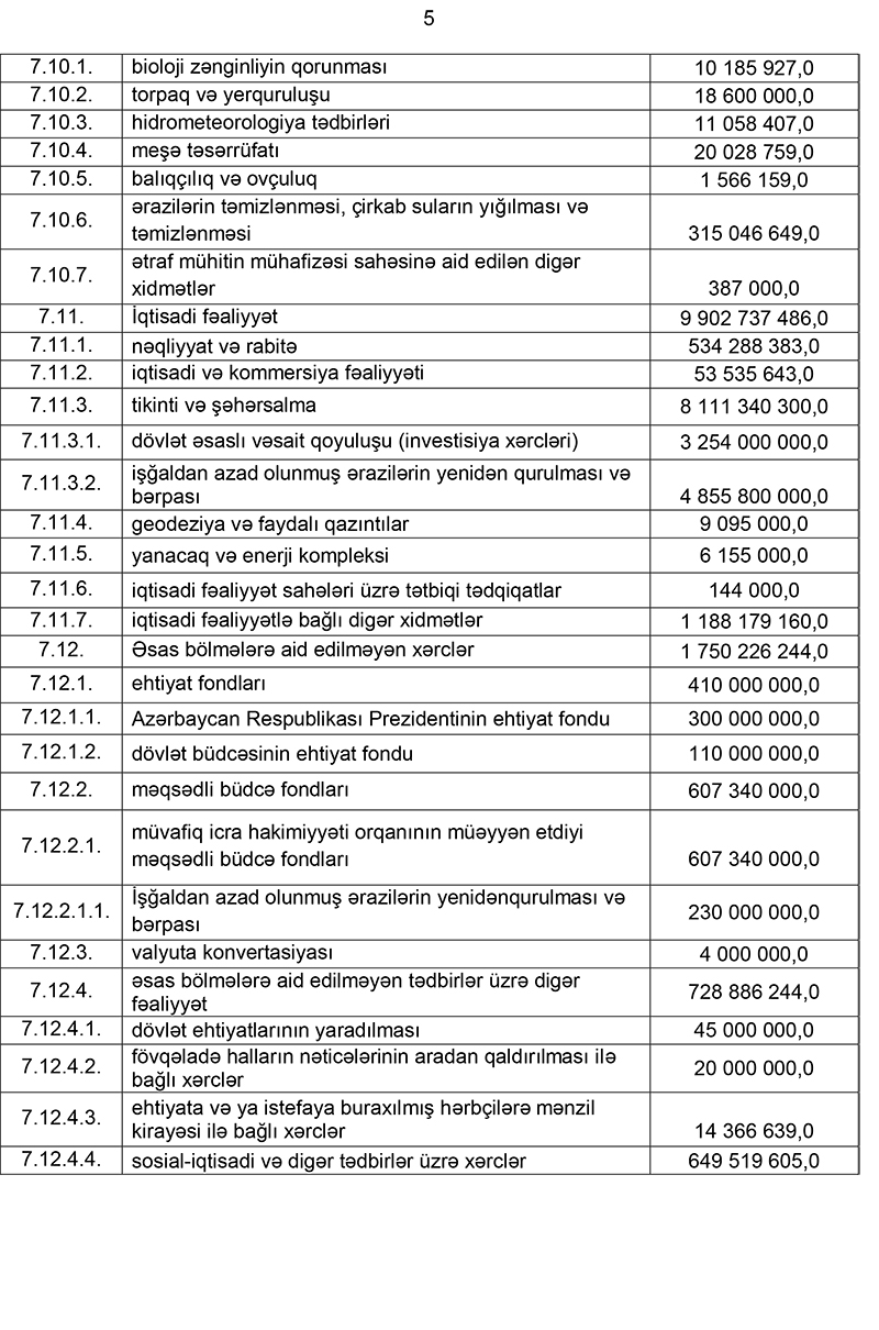 - Bir sıra yeni infrastruktur layihələrinin (avtomobil yollarının tikintisi, elektrik şəbəkəsinin gücləndirilməsi, suvarma və irriqasiya sistemlərinin yaxşılaşdırılması və s.) həyata keçirilməsi, habelə beynəlxalq fəaliyyət və tədbirlər üzrə xərclər, dəmiryol vasitəsilə şəhərətrafı sərnişin daşınması və digər daşımalar üzrə subsidiyaların verilməsi, nəqliyyat vasitələrinin utilizasiyası fondunun xərcləri və digər zəruri əsaslı alışlar üzrə əlavə maliyyə təminatının yaradılması;