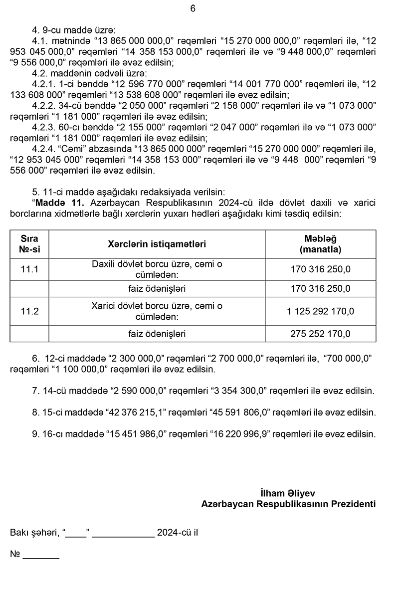 Azərbaycan Respublikasıın Prezidenti tərəfindən Milli Məclisə “Azərbaycan Respublikasının 2024-cü il dövlət büdcəsi haqqında” Azərbaycan Respublikasının Qanununda dəyişikliklər edilməsi barədə” Qanun layihəsi göndərilib.