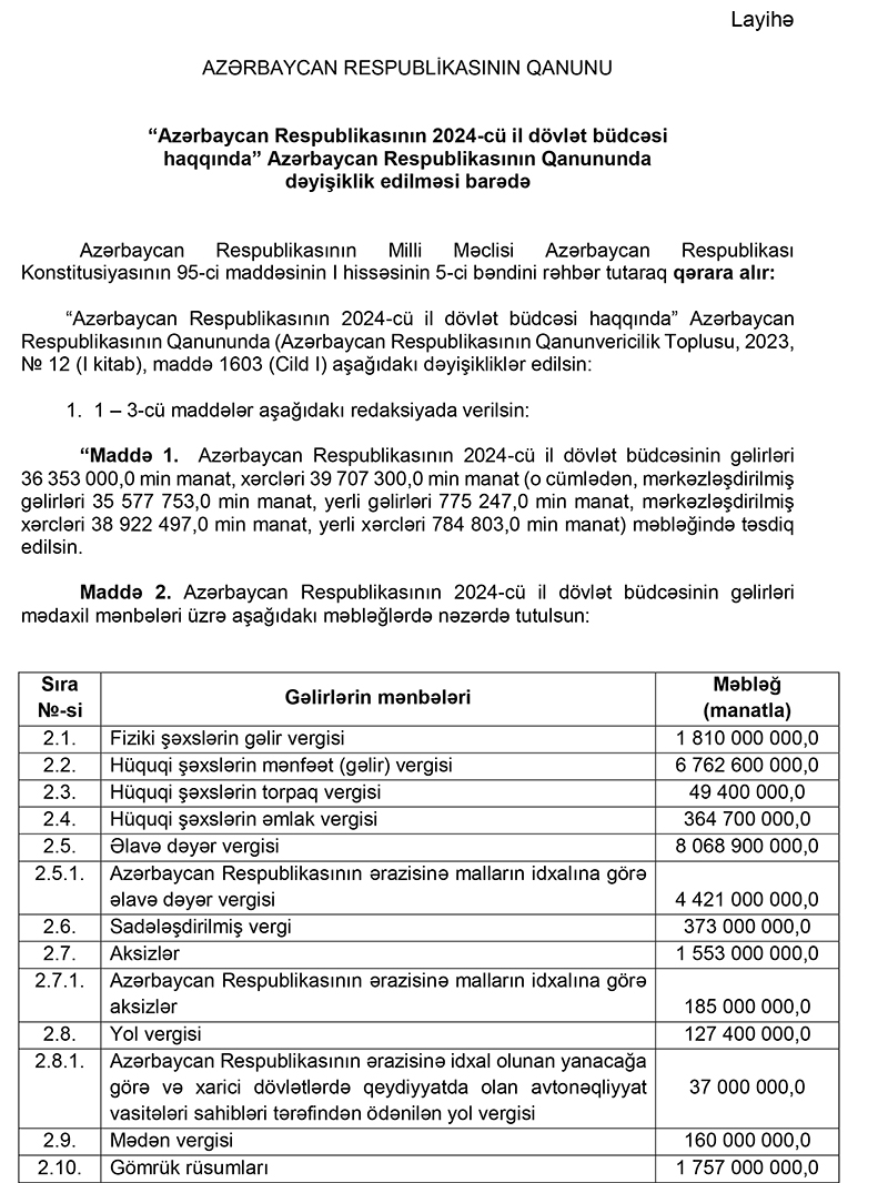 2024-cü il dövlət büdcəsinə dəyişikliklər “Büdcə sistemi haqqında” Azərbaycan Respublikası Qanununun 23-cü maddəsinə uyğun olaraq təklif olunur.