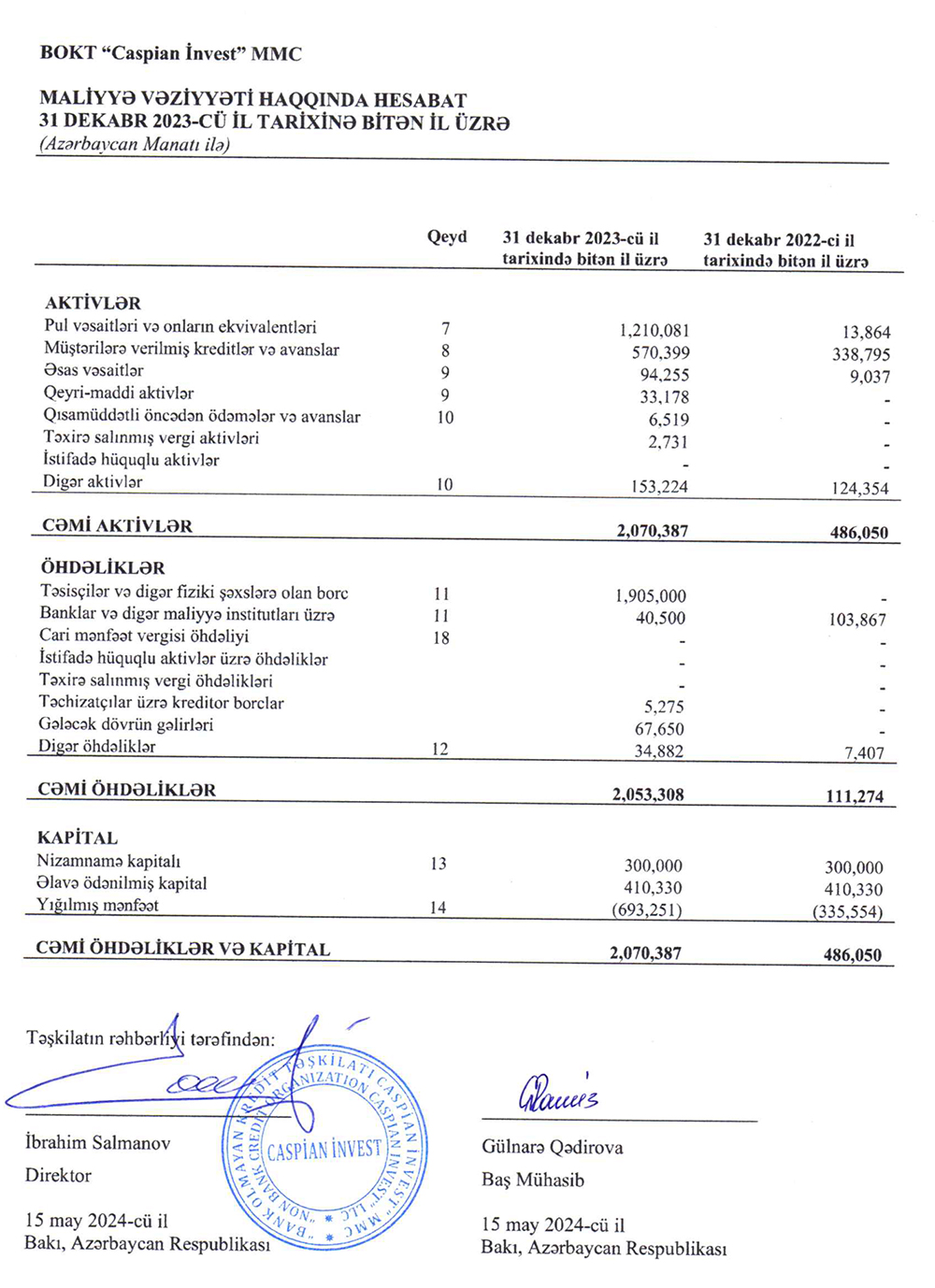 2023-cü ildə "BOKT Caspian İnvest"in pul vəsaitləri 87 dəfədən çox artaraq 1 milyon 210 min manatı ötüb. Vəsait təsisçilərdən və digər fiziki şəxslərdən cəlb olunub.