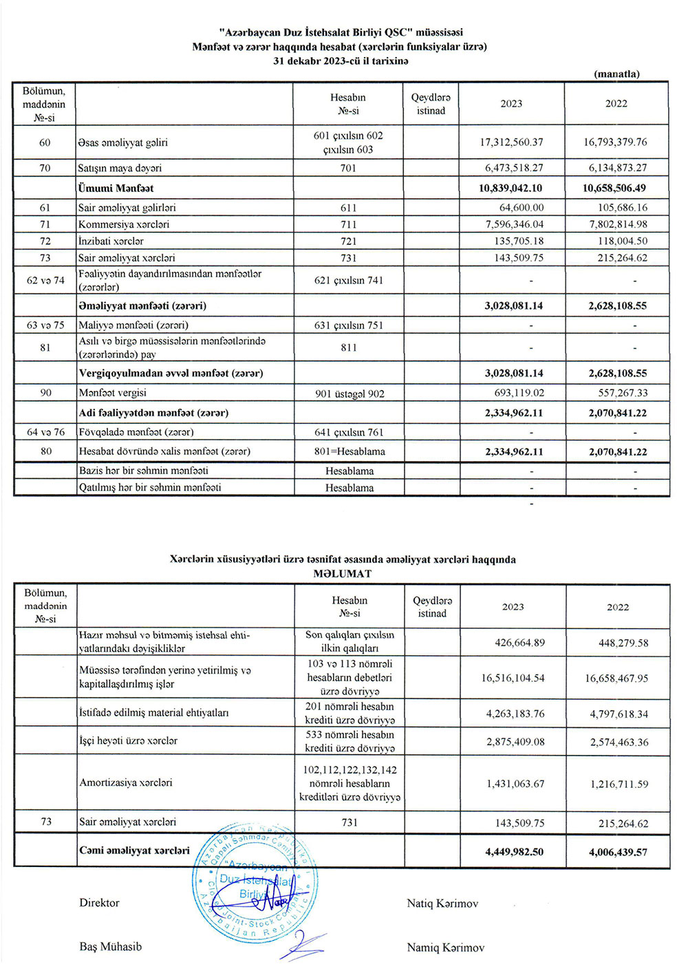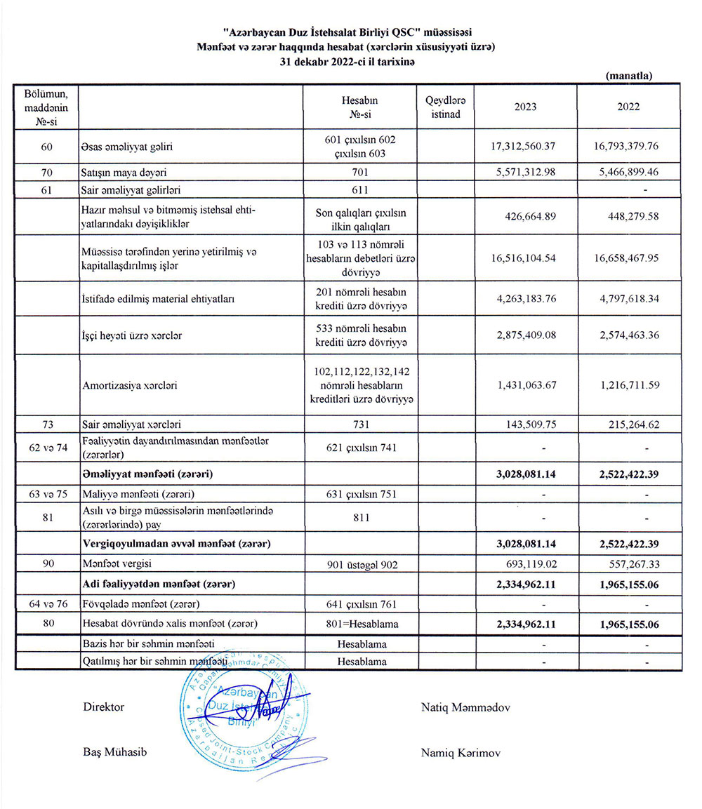 “Azərsun Holdinq” Şirkətlər Qrupuna daxil olan"Azərbaycan Duz İstehsalat Birliyi" QSC 2023-cü ili 2 milyon 235 min manat xalis mənfəət ilə başa vurub. Şirkət 2022-ci ili 2 milyon 71 min manat xalis mənfəət ilə bağlamışdı.