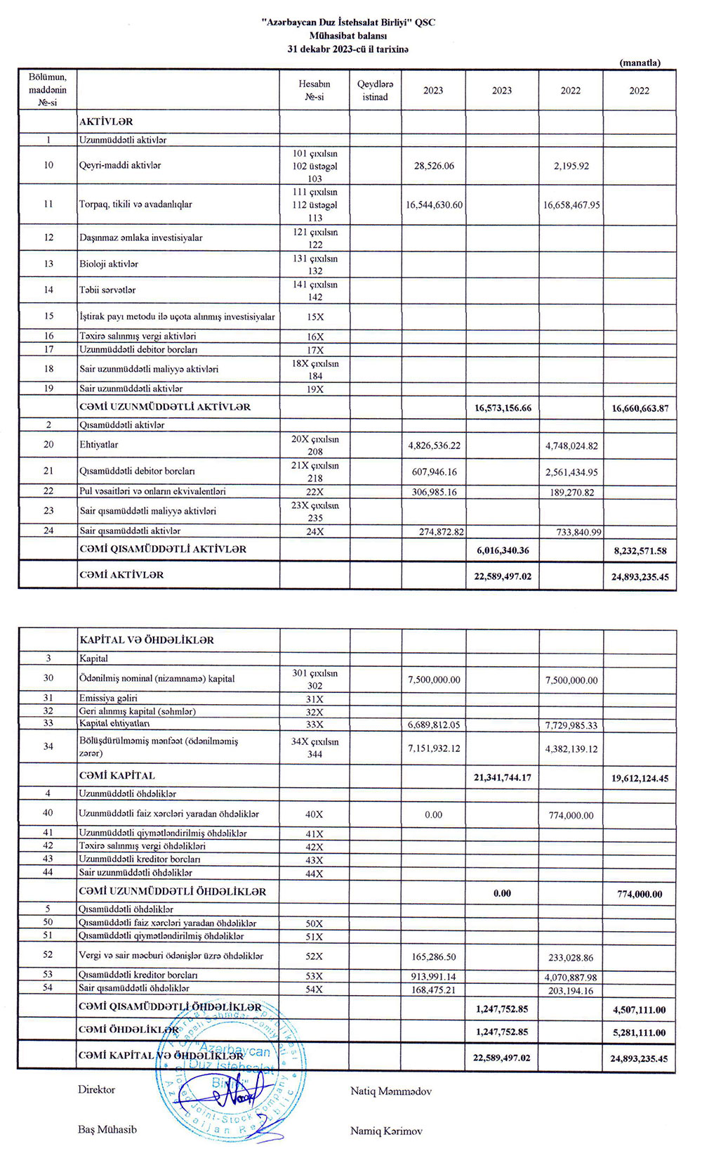 31 dekabr 2023-cü il tarixində "Azərbaycan Duz İstehsalat Birliyi" QSC 22 milyon 589 min manat cəmi aktivlərə malik olub. Şirkət 2022-ci ilin sonunda 24 milyon 893 min manat cəmi aktivlərə malik idi.