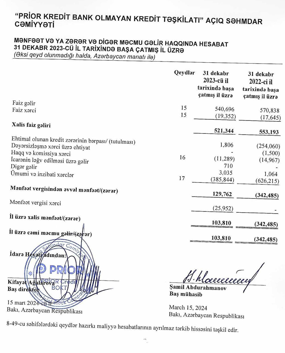 "Prior Credit BOKT" ASC 2023-cü ili 104 min manat xalis mənfəət ilə başa vurub. Kredit şirkəti 2022-ci ili 342 min manat xalis zərər ilə bağlamışdı. 2022-ci ildə zərər ehtimal olunan kredit zərərələri üçün yaradılmış ehtiyat ilə əlaqədar idi. 2023-cü ildə ehtiyatdan vəsait azad olub.