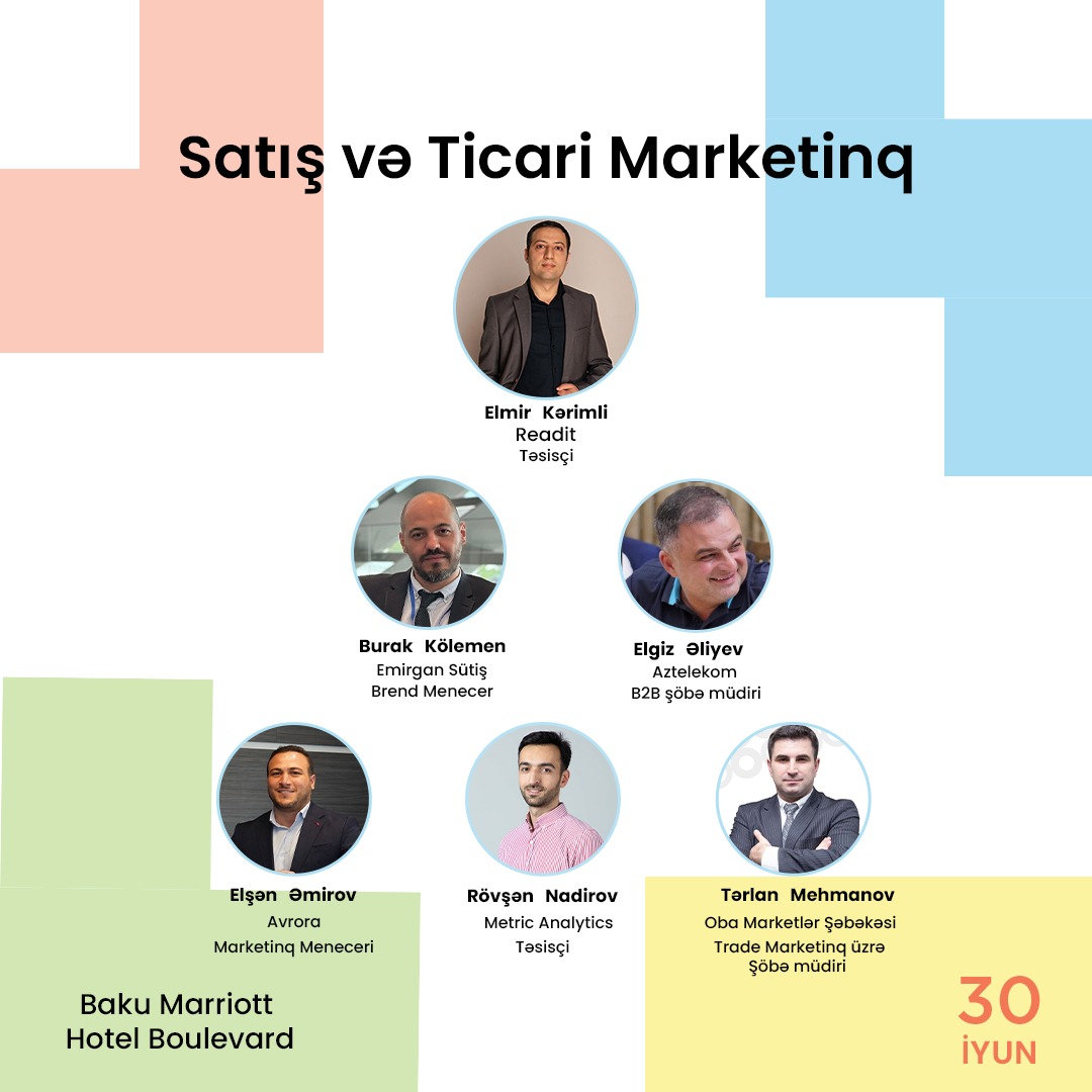 “Satış və Ticari Marketinq” paneli “Readit.az” təsisçisi Elmir Kərimlinin moderatorluğu ilə keçiriləcək. “Avrora” şirkətinin marketinq meneceri Elşən Əmirov, “Metric Analytics” şirkətinin təsisçisi Rövşən Nadirov, “Oba Marketlər Şəbəkəsi”nin trade marketinq üzrə şöbə müdiri Tərlan Mehmanov, “Aztelekom” MMC-nin B2B şöbə müdiri Elgiz Əliyev, “CEO's Lounge” şirkətinin brend meneceri Burak Kölemen ticari marketinq sahəsi üzrə müzakirələr edəcəklər.