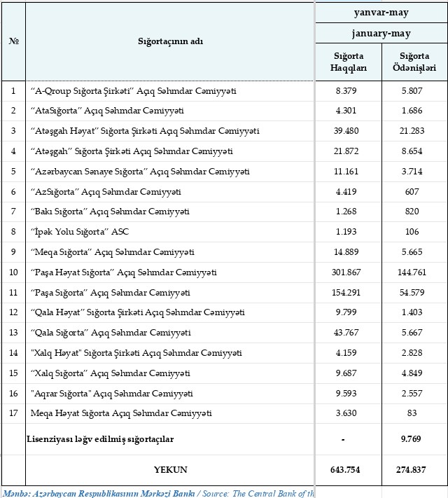 2024-cü ilin yanvar-may dövründə Azərbaycanın 17 sığorta şirkəti tərəfindən 643 milyon 754 min manat sığorta haqları hesablanıb, 274 milyon 837 min manat sığorta ödənişləri verilib.