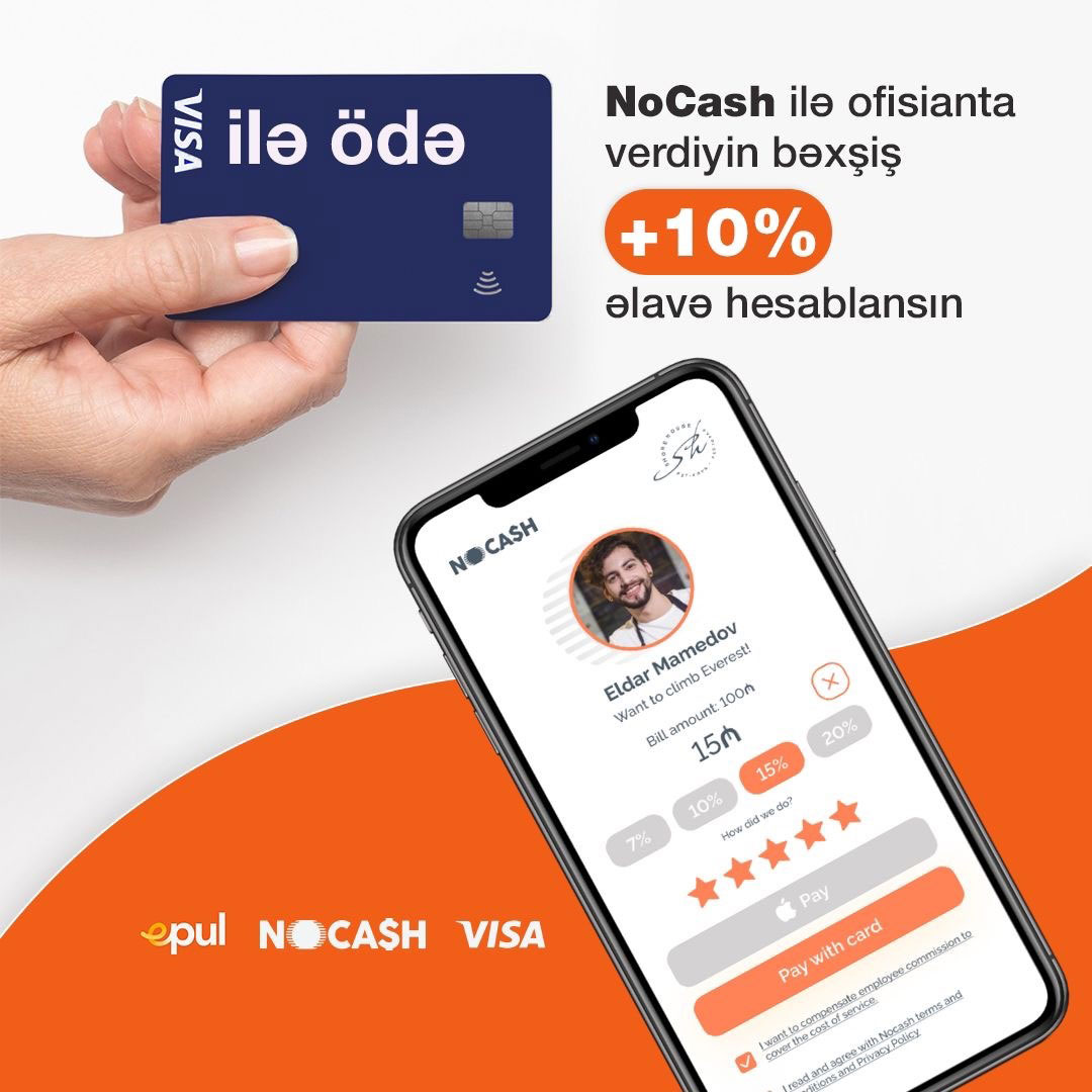 E-PUL və Visa ödəniş xidməti ölkədə restoranlar şəbəkəsində NOCASH platformasından nağdsız bəxşişlərin qəbulu üçün stimullaşdırıcı kampaniyaya başlayıb. VİSA bank kartı sahibləri Apple/GPay istifadə edərək nağdsız bəxşiş ödəyə bilərlər.(®) E-PUL ödəniş xidməti NOCASH startapı və Visa şirkəti ilə birgə ölkənin əksər restoranlarında nağdsız bəxşişlərin qəbulunu stimullaşdırmaq üçün kampaniyaya başladığını elan etdi.